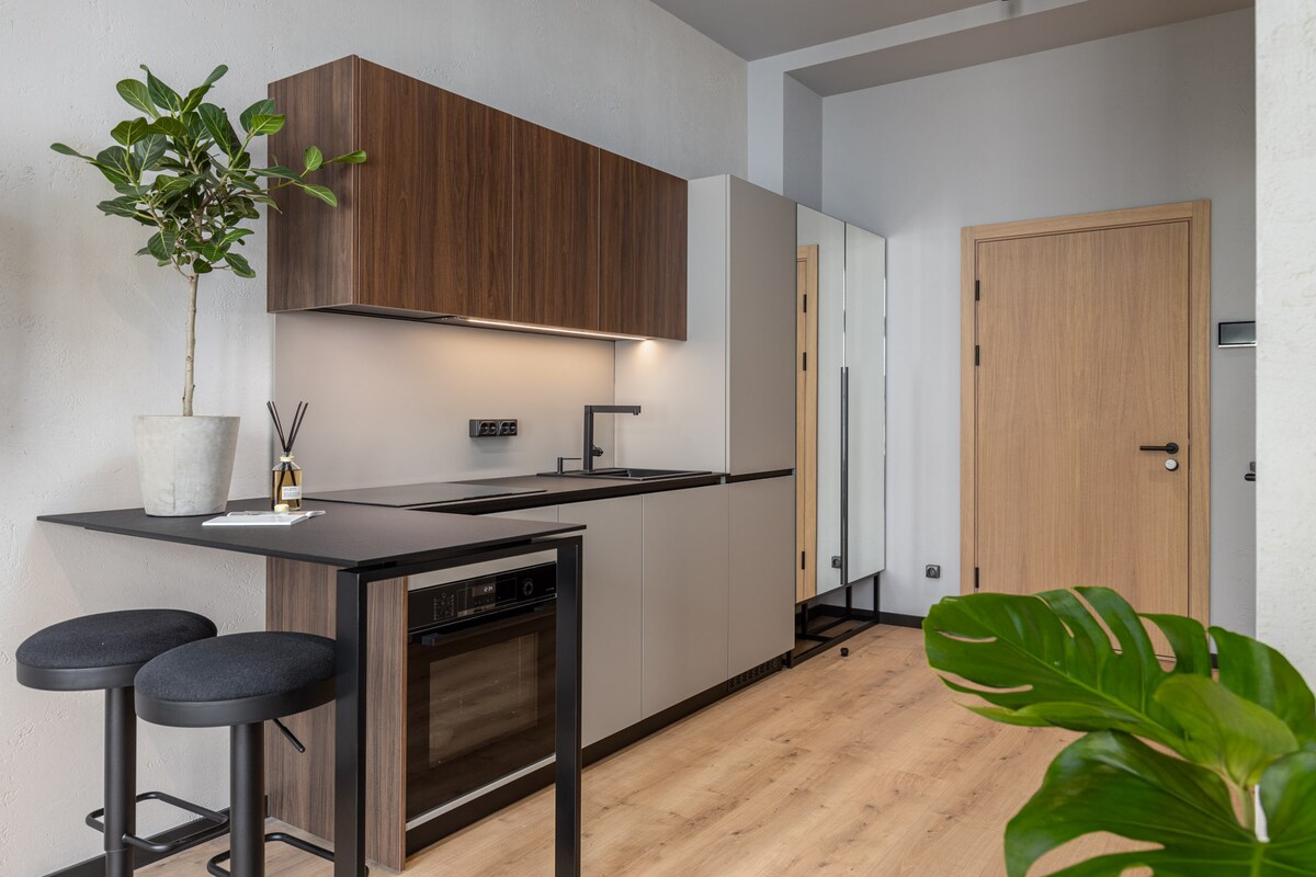 Selamat datang di Hallo Loft! Temukan apartemen canggih kami dengan kamar tidur berdinding kaca di pusat Riga. Menampilkan desain yang ramping dengan perabotan modern dan aksen bergaya, ruang ini mencakup dapur lengkap, kamar tidur yang nyaman, kamar mandi modern, dan ruang tamu yang nyaman dengan pemandangan Jalan Krisjana Barona. Terletak di pusat kota yang semarak, Anda hanya beberapa langkah dari kafe, restoran, pertokoan, dan pusat kebugaran. Rasakan kenyamanan dan kemudahan modern di Hallo Loft!