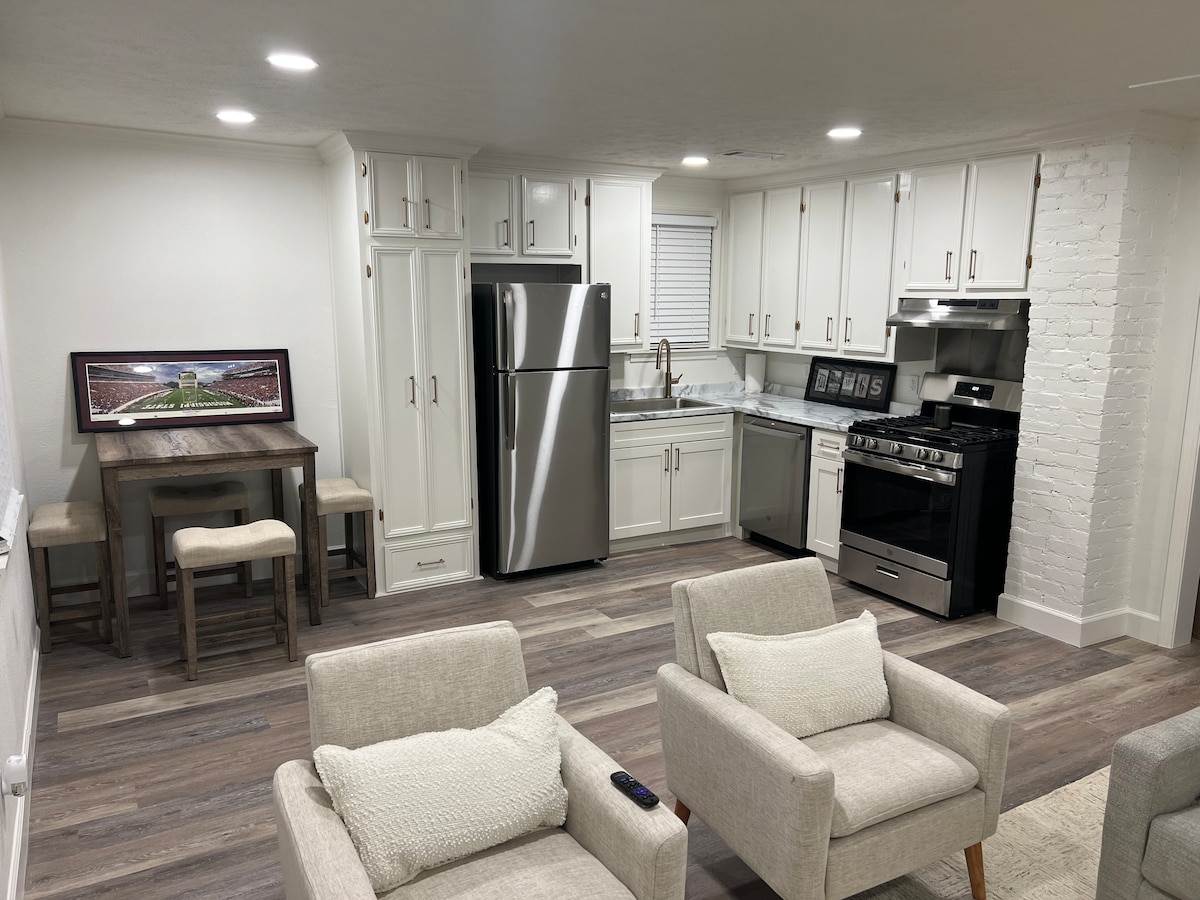 Once a Man Cave, now your serene escape! This cozy haven features a sprawling island, ample seating, & a 75" flat-screen smart TV with surround sound–perfect for entertaining guests with games or movie nights. With its open-concept layout & soaring vaulted ceilings, the living area exudes a spacious cabin ambiance. Nestled in a peaceful rural community, this one-of-a-kind retreat is bathed in abundant natural light through its expansive front windows, elevating the overall tranquil atmosphere.