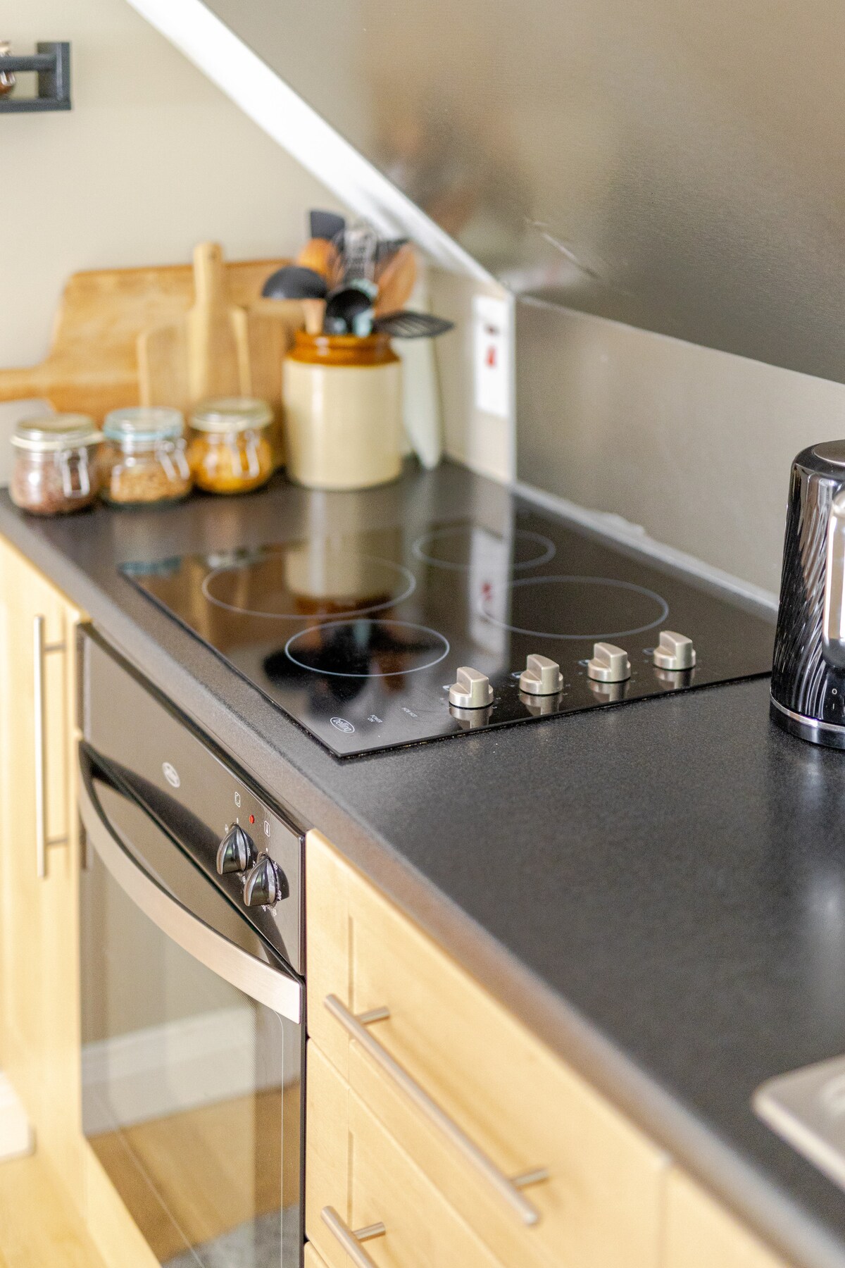 Ini adalah ruang loteng mandiri dengan pintu masuknya sendiri, namun tetap menjadi bagian dari rumah kami. Tempat ini memiliki kamar mandi ensuite sendiri, dapur/area makan kecil dengan kulkas, microwave, pemanggang roti, ketel, wastafel, dan hot - plate portabel 2 cincin. Harap perhatikanโฆ.. TIDAK memiliki oven. Tempat ini juga memiliki sofa & TV satelit. Juga terdapat akses ke Internet WiFi kami.