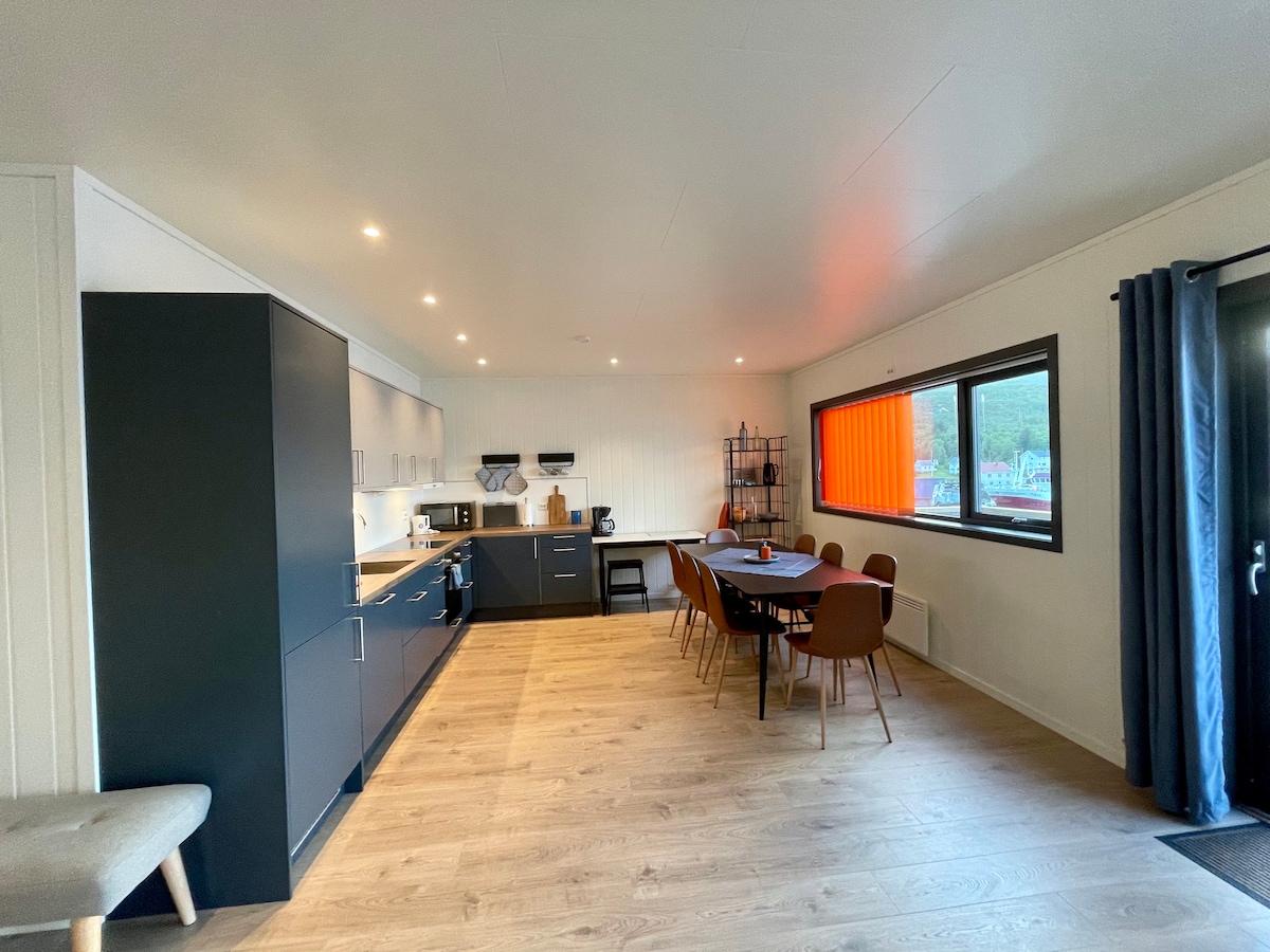 Panorama Bryggekanten adalah apartemen besar yang modern dan lengkap seluas 90m2. Di sini anda bisa menikmati pemandangan Malangen dan Kvaløya. Apartemen ini memiliki dua kamar tidur, 4 tempat tidur single (90 cm), ruang tamu besar, dan dapur yang dilengkapi dengan area makan yang nyaman. Kamar mandi besar dengan bilik pancuran dan mesin cuci/pengering gabungan. Parkir gratis di pintu masuk. Tempat ini terletak di tengah desa kecil yang menyenangkan di Botnhamn, yang merupakan awal dari rute wisata nasional ke Gryllefjord.