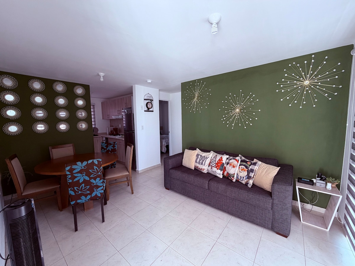 Disfruta de lo acogedor de este alojamiento tranquilo y céntrico, a dos cuadras de centro de convenciones y feria. Ubicado en primer piso de conjunto habitacional privado con cajón de estacionamiento en frente del depto. Hermoso mobiliario y acabados.