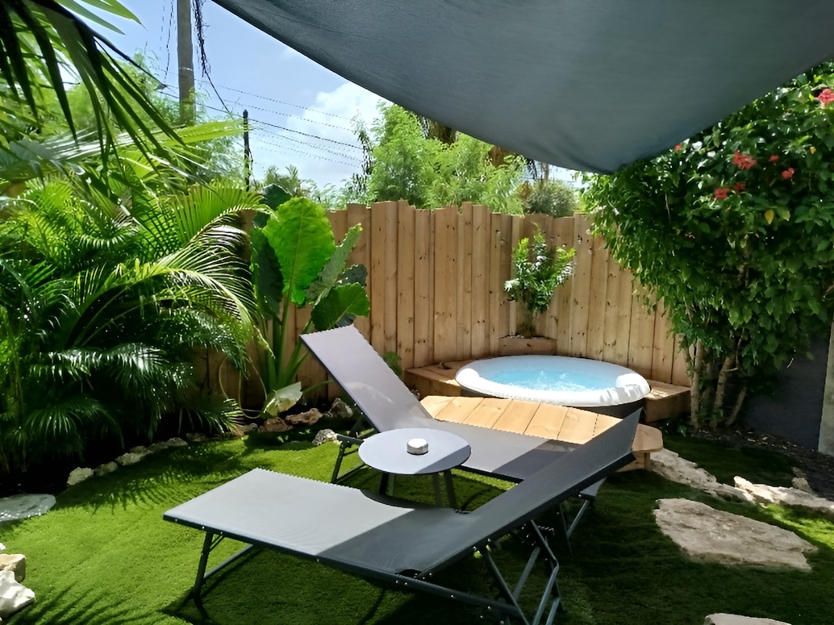 Selamat datang di tempat peristirahatan kami yang nyaman! 🌴 Anda akan berada dekat dengan pantai berpasir putih dan pasar paling semarak di pulau ini. Jacuzzi pribadi akan memastikan relaksasi murni setelah seharian menjelajahi wilayah ini. Temukan kebahagiaan tidur siang di tempat tidur luar ruangan, diselimuti angin tropis yang lembut. Benamkan diri Anda di bak mandi tempat air hangat akan menenangkan Anda di tengah alam. Kami menantikan berbagi keajaiban sepotong kecil surga kami dengan Anda.