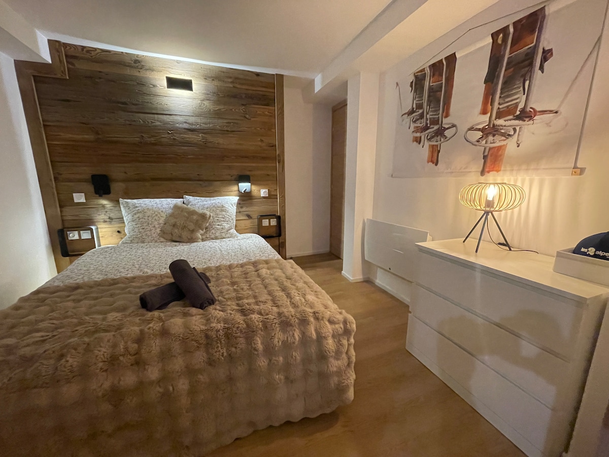Properti terletak di kaki lereng, 1 menit dari Télémix du Diable, 2400m dalam 6 menit dan berada di tengah - tengah resor. Devil's Refuge yang menghadap ke selatan dengan pemandangan Muzelle yang indah. Studio di lantai 2, dengan bahan alami, mencakup pintu masuk, kamar mandi dan toilet, ruang tamu: dapur lengkap, oven, microwave, area makan yang luas, TV, sofa bed selebar 160 cm, kompor listrik, dan loker ski. Saya tetap siap menjawab segala pertanyaan Anda.