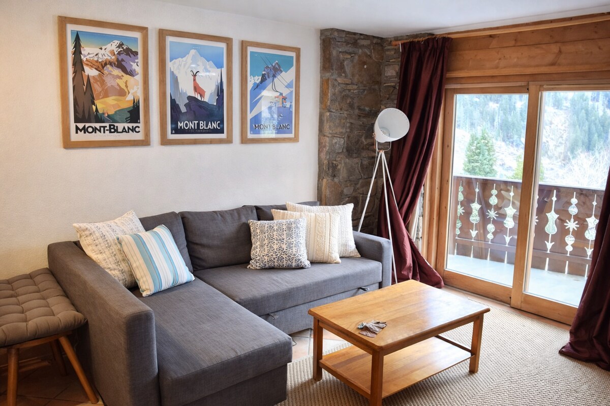 Apartemen 44 m2 di lantai 2 dan di lantai paling atas (tanpa lift) gedung bergaya chalet yang sangat tenang: - 2 double bed, - 1 Kamar Tidur dengan 2 Tempat Tidur Single Bunk, - Ruang tamu dengan sofa convertible 2 tempat duduk. - 2 Kamar mandi (1 dengan bak mandi, 1 dengan pancuran) - 2 balkon, pemandangan polos dan pemandangan rantai Mont Blanc. - Wifi, TV, mesin kopi, oven, mesin cuci, mesin cuci piring, microwave... - Garasi + area parkir - Supermarket di kaki chalet dengan pom bensin, bus 2 menit berjalan kaki.
