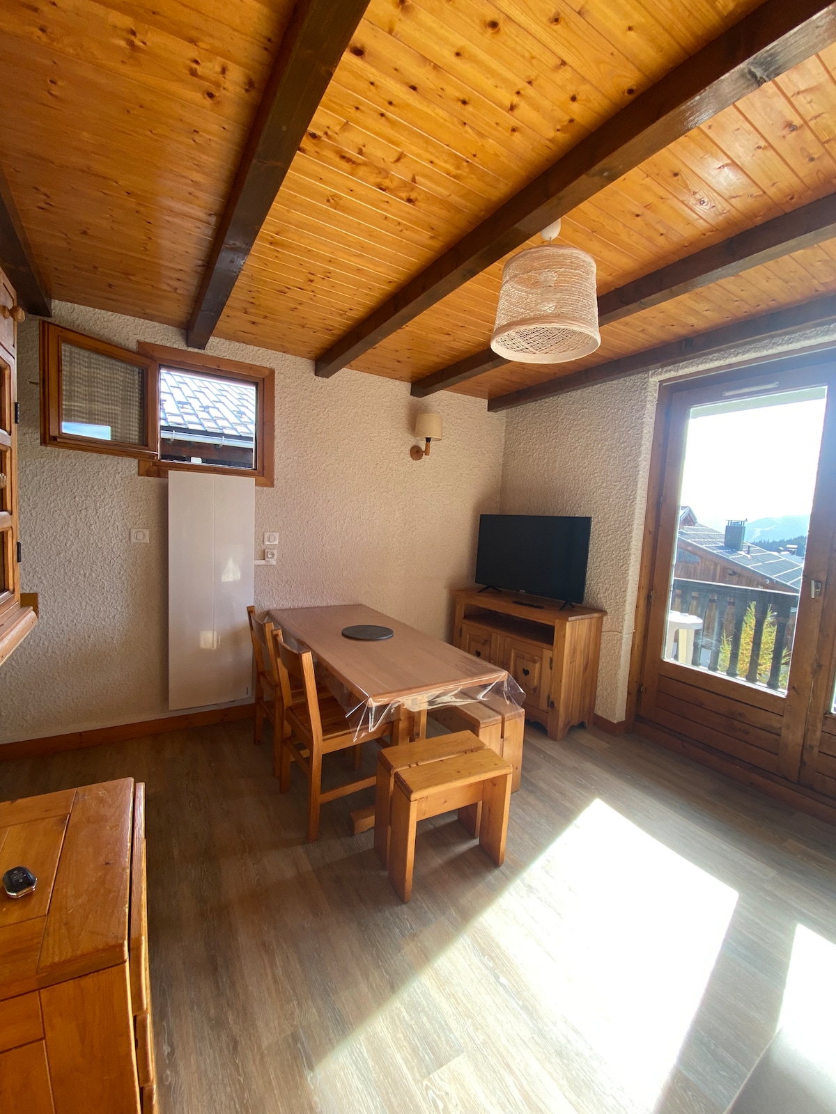 Apartemen ini terletak di stasiun, dekat dengan Avenue des JO dan toko - tokonya. Di lantai 2 tempat tinggal yang menawarkan pemandangan terbuka di atas Bisanne dari balkon yang menghadap KE SELATAN. Dilengkapi dengan TV, kompor listrik, oven/microwave, pembuat kopi Senseo, set raclette, kamar mandi dan toilet 4 tempat tidur; satu klik + 2 tempat tidur tempat tidur susun di ceruk independen + tempat tidur tambahan. Loker ski pribadi, Toboggan. Seprai tidak disediakan dan pembersihan akhir masa inap adalah tanggung jawab tamu