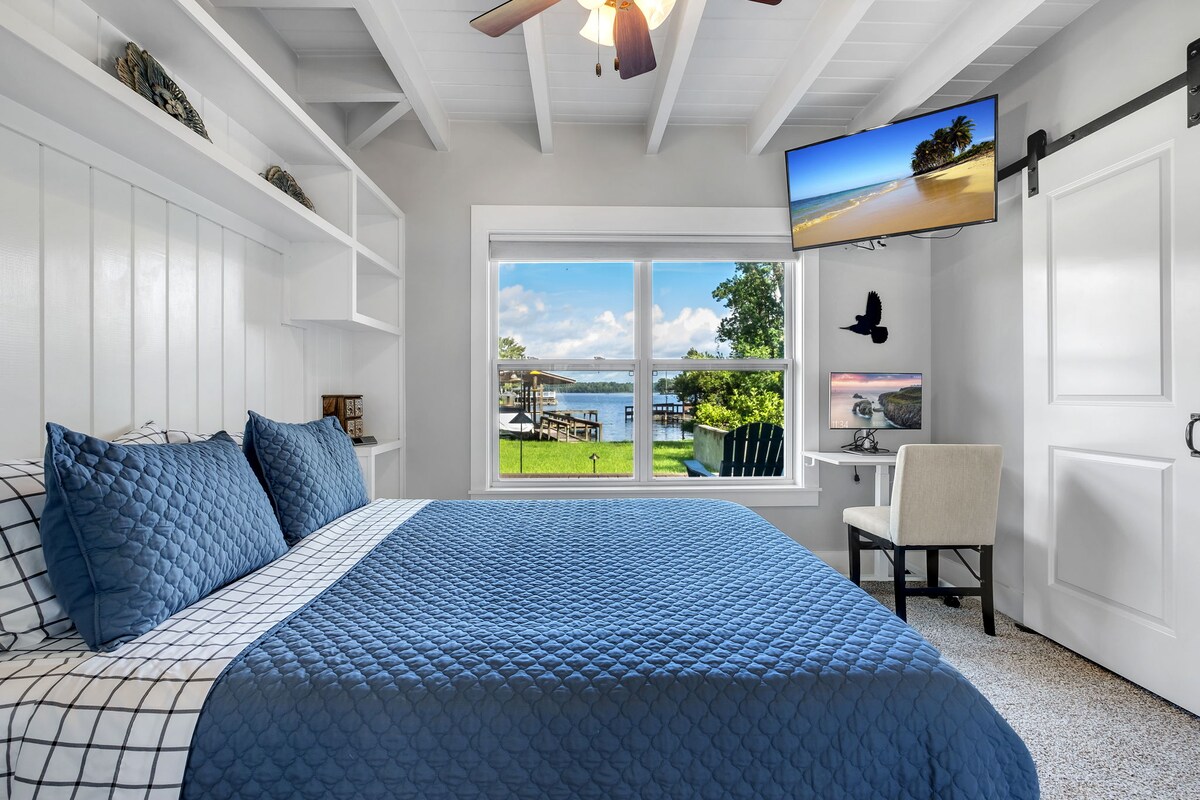 Bersantailah dan bersantailah di tempat yang tenang dan bergaya ini. Nikmati pemandangan danau yang indah dari ruang tamu yang luas, dapur/area makan. Dapur dilengkapi dengan segala sesuatu untuk membuat makanan favorit Anda. Tonton film yang bagus, sambil menghangatkan diri di perapian yang nyaman. Mainkan permainan kolam renang yang kompetitif, sambil menikmati pemandangan yang menakjubkan. Bersantai di ayunan tempat tidur dengan buku yang bagus atau duduk di dermaga dan nikmati matahari terbenam yang menakjubkan. Anda akan sangat menyukai rumah dermaga ini; tempat ini memberi Anda nuansa seperti berada di rumah perahu.