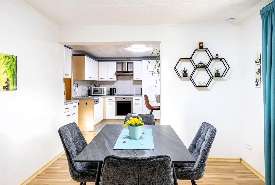 Apartemen ini memiliki pintu masuknya sendiri, teras tertutup dengan tempat duduk/bersantai dan fasilitas BBQ tepat di sebelahnya. Dapur terbuka berperabot lengkap (oven, microwave, pembuat kopi) menawarkan ruang untuk keluarga atau maksimal tiga orang dengan meja makan. Area tidur digunakan bersama di ruang tamu dan kamar tidur. Parkir/garasi pribadi di seberang, sepeda dapat diparkir di garasi dan e-bike dapat diisi daya.
