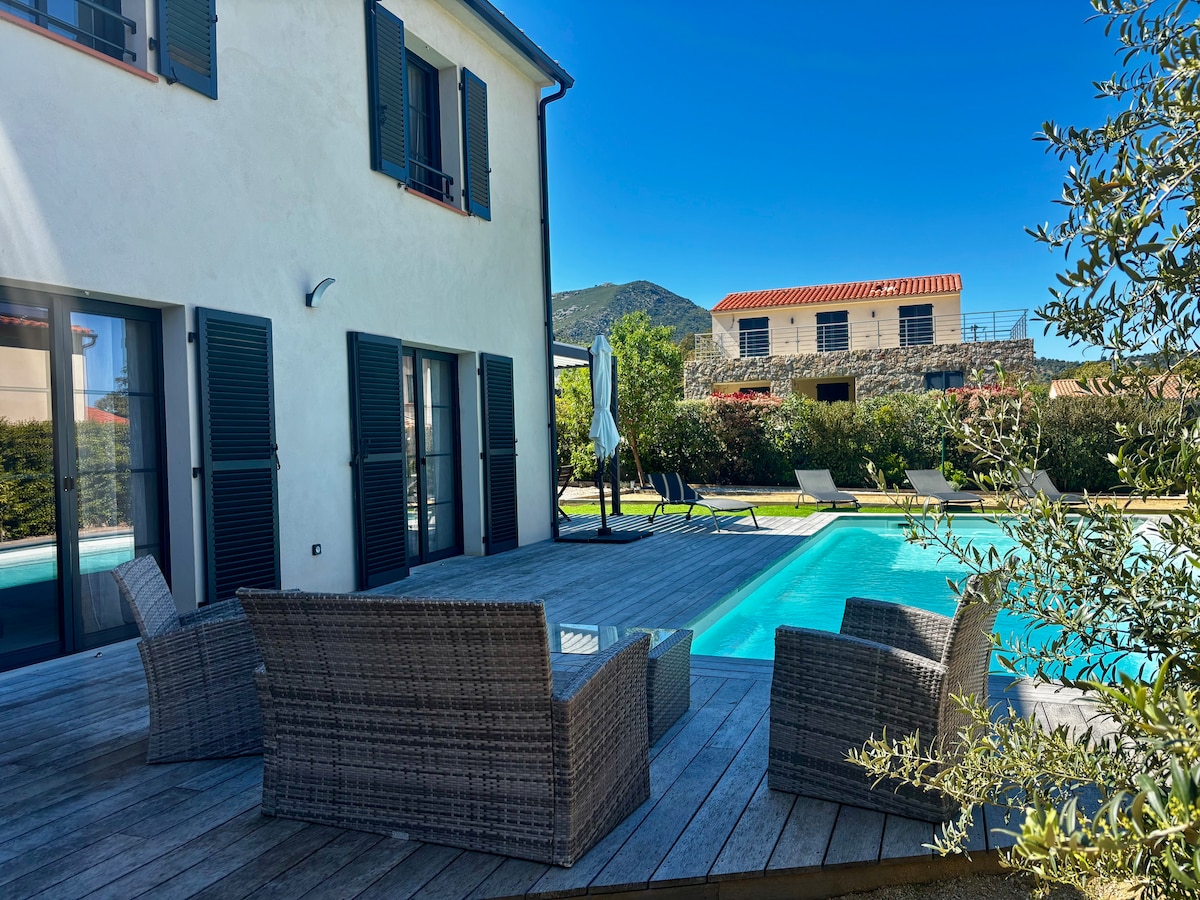Villa de plein pied neuve avec piscine, entourée d’oliviers et vue splendide sur la mer, dans un lieu calme. À 5min des plages de Bodri. Seulement 20min de l’aéroport Calvi St-Catherine et 5min du centre d'Ile-Rousse. 3 suites parentales privées, 3 salles de bain Cuisine ouvrant sur les terrasses face à la mer et piscine. Grande terrasse face à la mer, studieux patio pour vos repas à l’abris du vent. Conçue et décorée avec beaucoup de soin. Pour que vos vacances deviennent inoubliables.