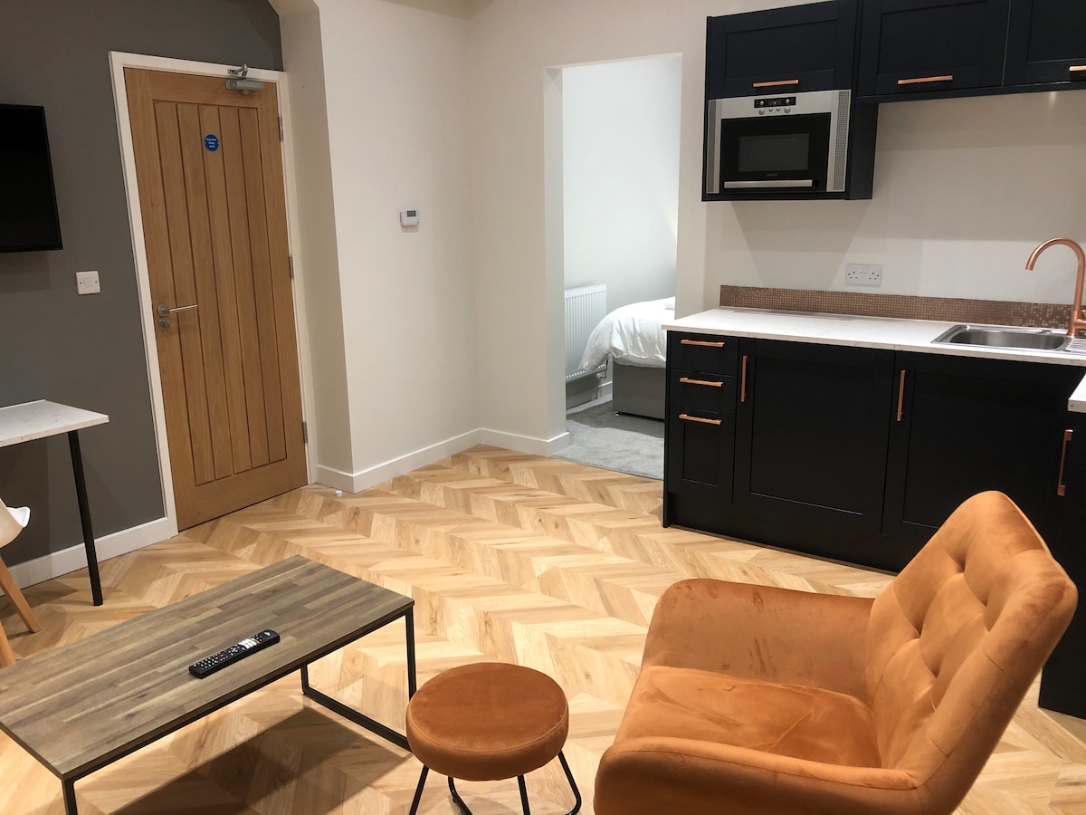 Studio modern di pusat kota Nottingham di bagian belakang gedung sehingga lebih tenang. Hanya 100 m dari Victoria Centre dan Market Square. Double bed dan ensuite, juga dilengkapi dengan dapur dengan spesifikasi tinggi termasuk kompor AEG, mesin cuci / pengering, kulkas dan microwave panggangan. Tempat ini memiliki internet wifi cepat, sofa kecil, TV Samsung 40"pintar 4k terpasang TV, meja bar dengan bangku bar kulit. Check - in mandiri fleksibel dari brankas kunci di pintu masuk utama.