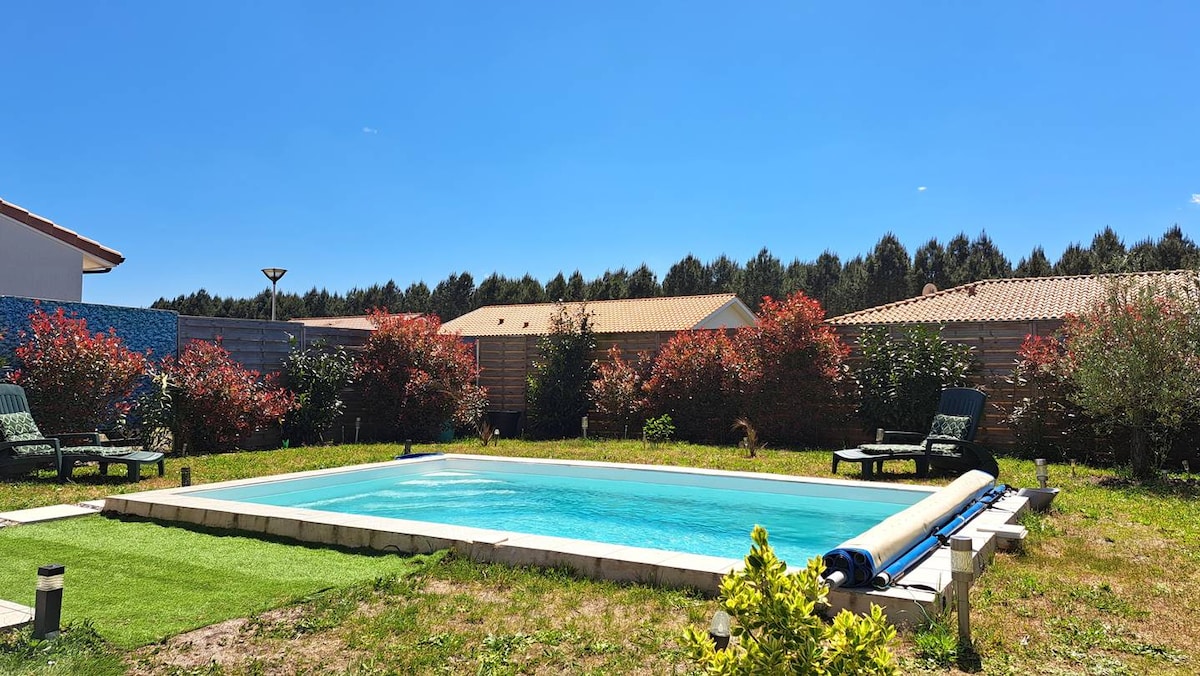 Rumah baru di lahan besar seluas 1400m2 di luar subdivisi dengan dekorasi bersih dengan 2 kamar tidur dan sofa modular di tempat tidur. Ada teras dan taman besar termasuk jacuzzi, barbeku, meja ping-pong. Kurang dari 10 menit dari Ocean dan Lake Leon, di mana Anda akan menemukan banyak aktivitas air (perahu pedal, kano, paddle boarding). Akses ke jalur sepeda berjarak kurang dari 2 menit. 400 m dari kompleks olahraga (bola basket, sepak bola, taman skate, boulodrome)
