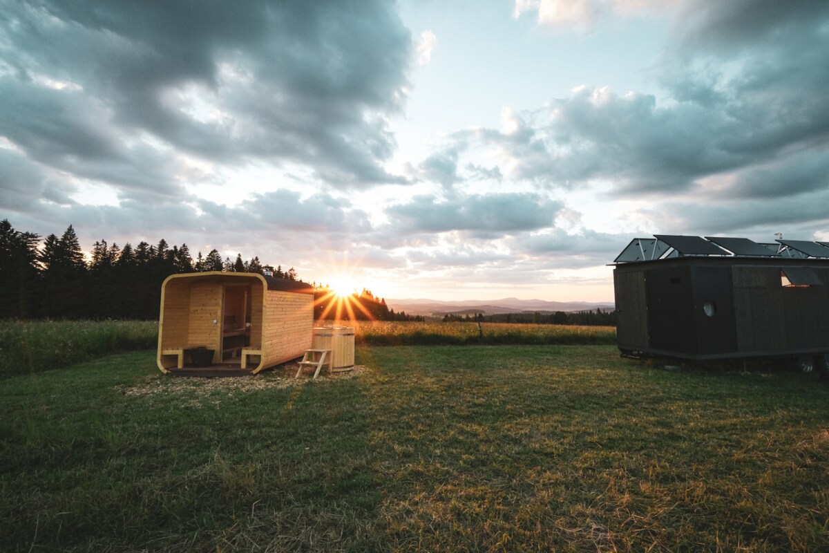 Akomodasi romantis di tepi sungai - kedamaian, alam, harmoni.... Nikmati masa inap yang luar biasa di karavan yang nyaman di alam, hanya beberapa langkah dari aliran air yang mengalir deras. Tempat ideal untuk pasangan, orang yang sendirian, atau semua orang yang ingin beristirahat dari hiruk pikuk kota. Di dalam, Anda akan menemukan interior yang nyaman dengan tempat tidur yang nyaman, pemandangan alam, dan dapur kecil untuk menyiapkan makanan sederhana. Di luar, Anda bisa menikmati duduk di dekat perapian, mendengarkan kicauan burung, atau hanya merendam kaki di air sungai yang jernih.