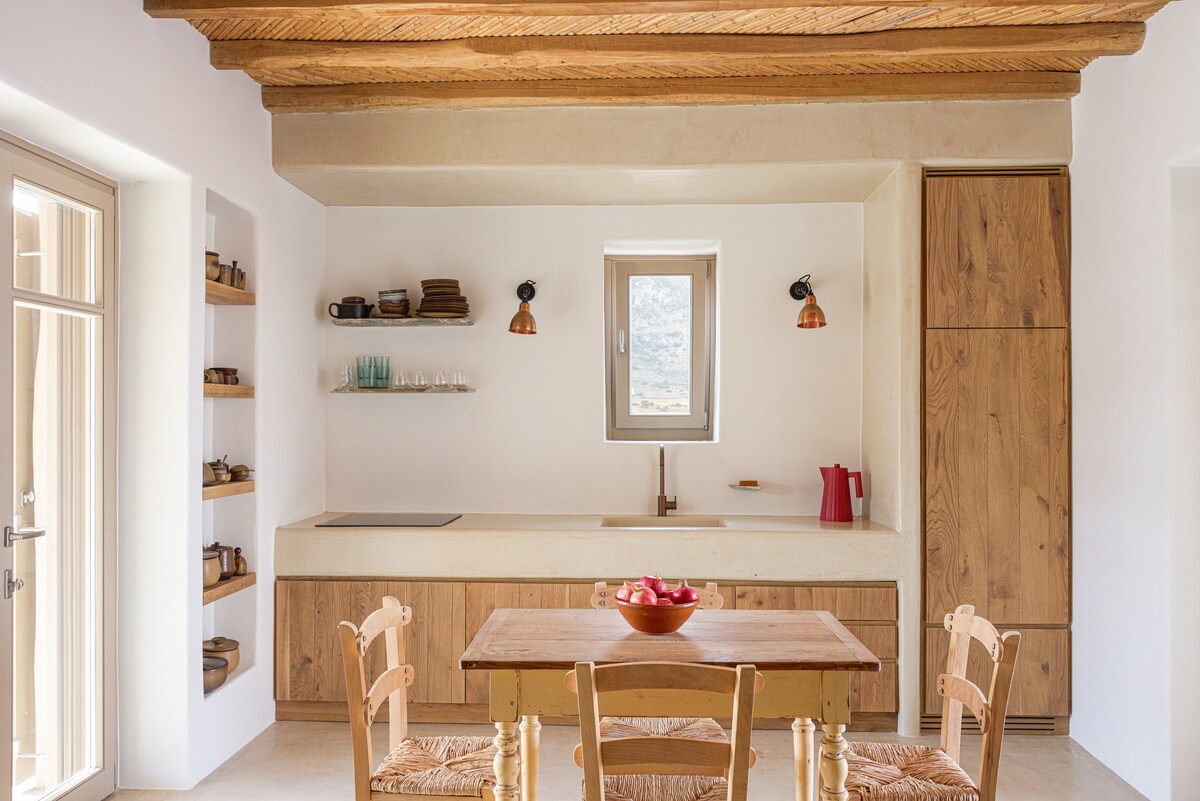 Rumah tamu tradisional kami terletak di Hora. Dibuat dengan hati - hati dan perhatian terhadap detail terkecilnya, terdiri dari ruang interior yang nyaman dan ruang eksterior yang menakjubkan, berpadu secara harmonis dengan lanskap alam di sekitarnya yang cocok untuk liburan pasangan. Karena arsitektur tradisionalnya adalah akses melalui tangga. Dan tempat ini memiliki pemandangan matahari terbit yang paling menakjubkan dan menyegarkan dari balkon.