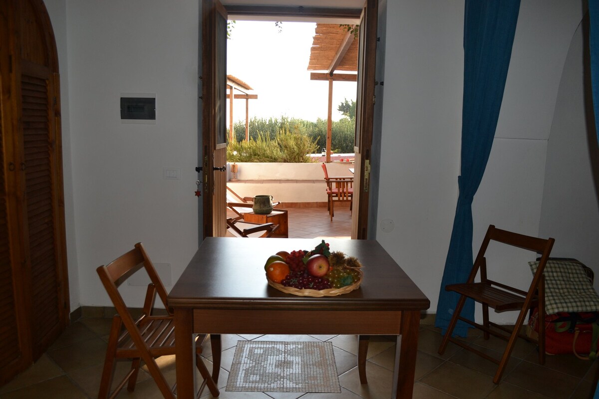 Dammuso asli klasik. Dari terasnya Anda bisa melihat seluruh distrik Scauri dan tatapannya hilang di cakrawala. Terdiri dari ruang tamu besar, dapur, kamar tidur dan kamar mandi dengan pancuran. Kamar mandi kecil kedua dengan vas, wastafel, dan pancuran terletak berdekatan dengan dapur. Terasnya memiliki tempat tidur gantung, meja, kursi dek, dan pemandangannya saat matahari terbenam. Mereka yang tinggal di La Meridiana juga akan bertemu dengan pemiliknya Anna, orang yang sangat manis dan bijaksana yang tinggal di dammuso sebelah IT081014C2VUKDXKGD