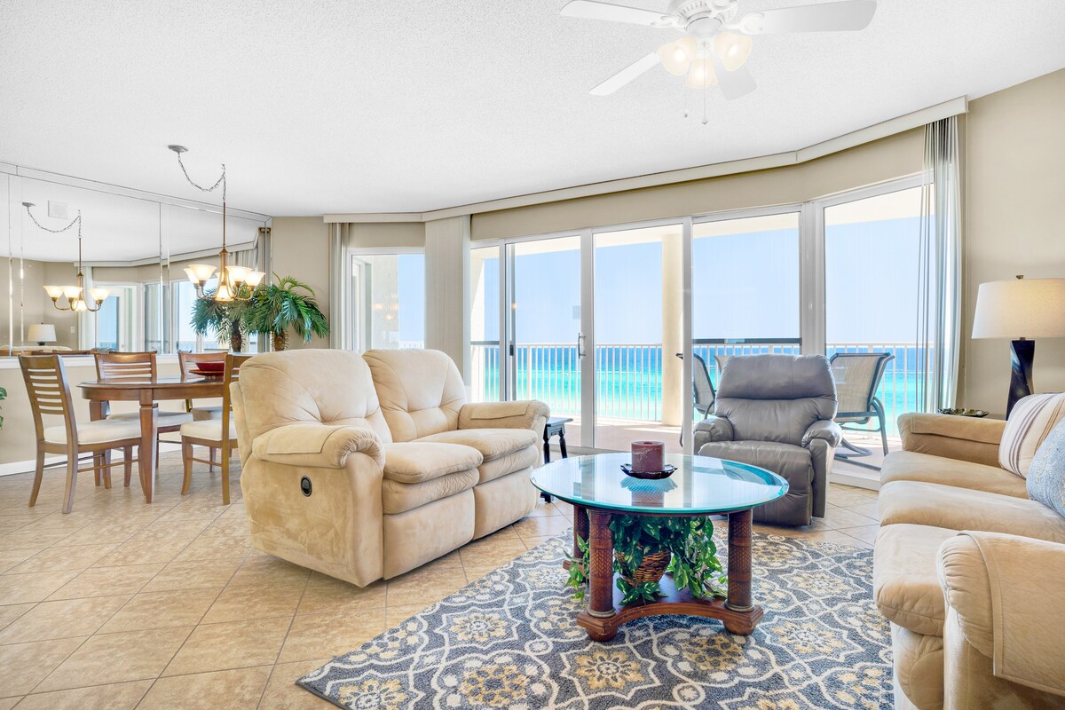 This GULF FRONT BEACH condo has a style all its own. Long Beach is a gated community and features the longest stretch of sand in PCB. This newly renovated condominium on the 7th floor has panoramic views of the Gulf from every room . Spanish-style ceramic tile floors & premium granite countertops throughout. The huge curved balcony attracts spectacular sunsets. The resort has low occupancy so the super-fast elevators won't leave you waiting. The resort has a 25 yo age minimum in order to book.