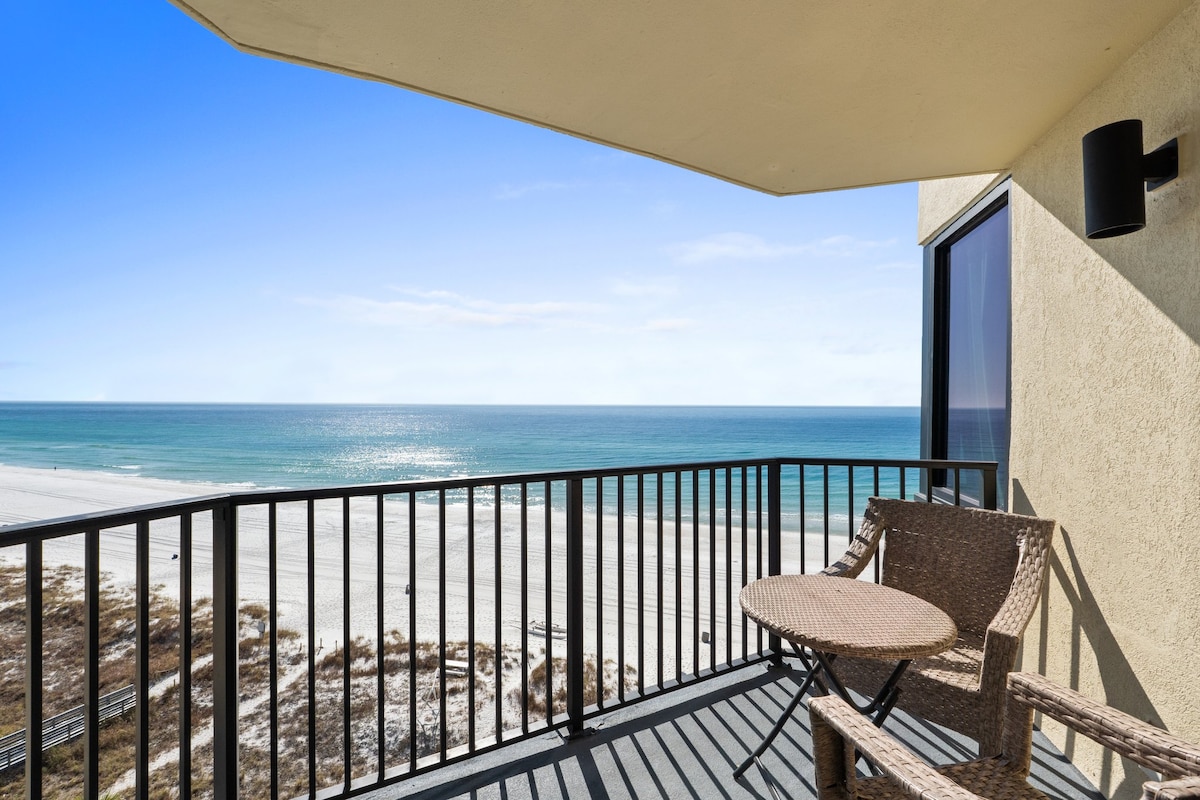 Nikmati liburan tepi pantai terbaik di studio tepi laut ini, yang menawarkan pemandangan menakjubkan Emerald Gulf. Mulailah hari Anda dengan secangkir kopi di balkon pribadi Anda sambil menyaksikan lumba - lumba berenang. Resor ini menawarkan fasilitas luar biasa, termasuk 5 kolam renang, 3 bak mandi air panas, bioskop, pusat kebugaran, lapangan tenis, Starbucks, H2O Bar & Grille, dan minuman di tepi kolam renang. Studio ini memiliki tempat tidur King, area makan, dapur lengkap, kamar mandi modern, 65" Raku Smart TV, dan mesin cuci/pengering dalam unit.