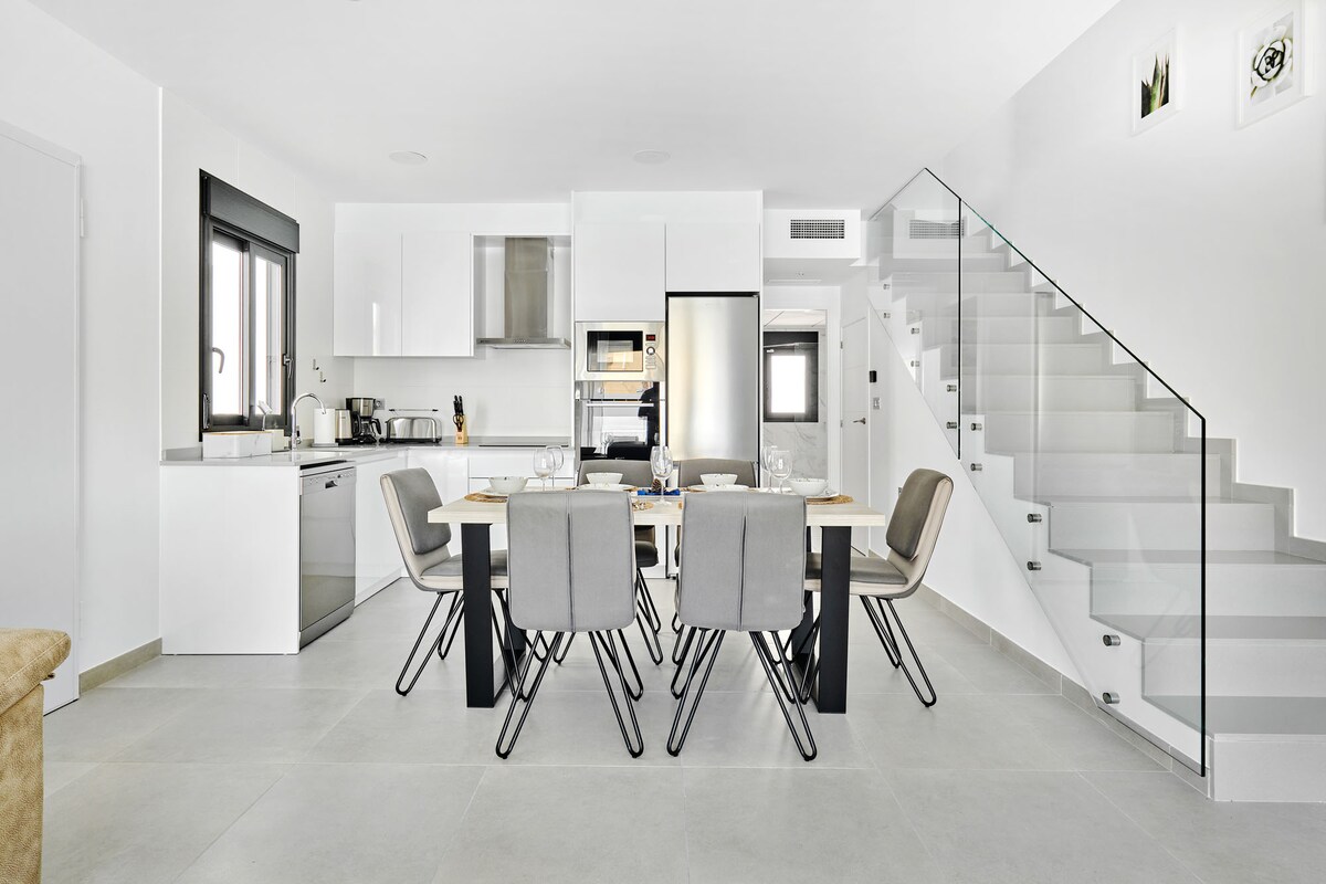 Rumah liburan modern berjarak 10 menit berjalan kaki dari pantai dan pusat kota. Terletak di sebuah pinggiran kota baru. Dengan taman, kolam renang, teras atap, dapur luar ruangan, dan 3 kamar tidur, dan 2 kamar mandi. Cocok untuk keluarga dengan dan tanpa anak. Parkir mobil di jalan masuk pribadi. Pusat perbelanjaan berjarak 5 menit berkendara. Kota - kota menarik, seperti Cartagena, Murcia, dan Alicante di dekatnya.