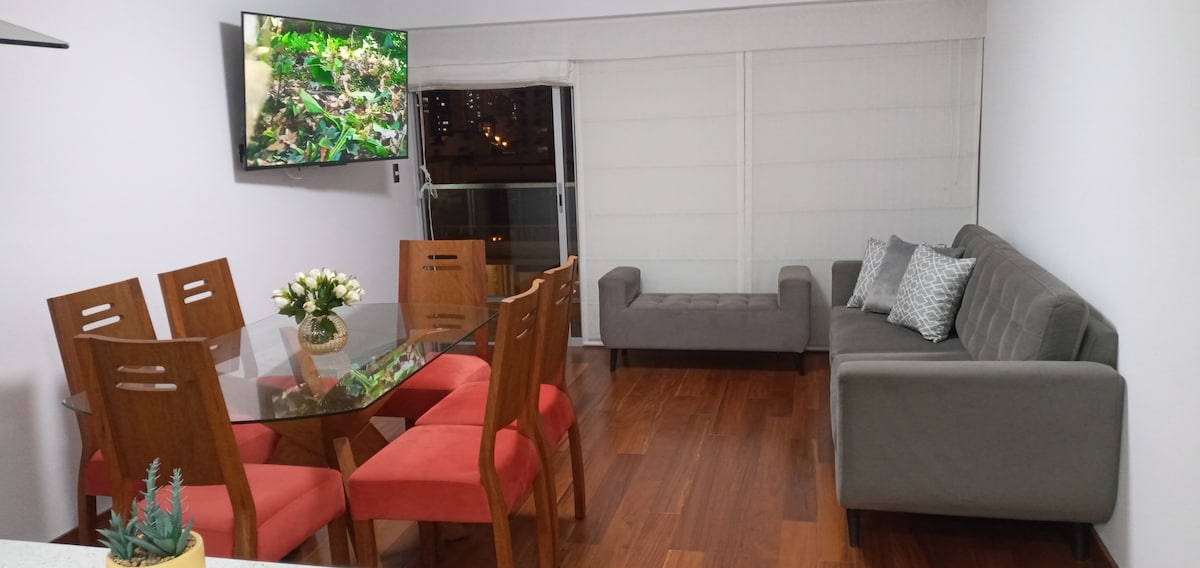 Es un apartamento cómodo, ubicado en el centro de miraflores a 1 cuadra del malecón, muy cerca a restaurantes, centros comerciales (larcomar), lugares turísticos, playas, entre otros. De 90 m2 de amplitud con 1 cama, 1 baño completo y 1 medio baño, 1 cocina, sala y comedor. El apartamento está en un sexto piso con ascensor. Un lugar muy acogedor y en uno de los distritos más importantes de Lima.