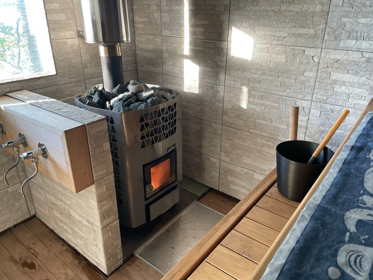 Meren äärellä saunallinen mökki