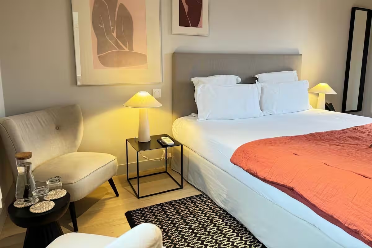 Kamar nyaman (12 -14 m²) untuk 2 orang dewasa, dilengkapi dengan tempat tidur 140 cm. Diatur dengan baik, tempat ini membentuk kepompong nyata untuk bersantai. Seprai kelas atas, duvet nyaman, TV layar datar, Wi-Fi berkecepatan tinggi, dan produk sambutan Algotherm. Terletak ideal di Hotel Le Fer à Cheval, di pusat kota Trouville-sur-Mer.