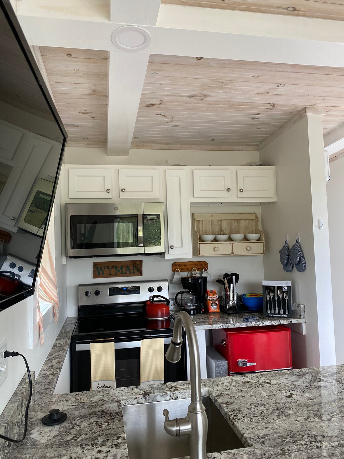 Modern studio apartment in a historic building in Eastport Maine. 460 sq ft with private deck, king-sized bed, sitting area w/gas stove, galley kitchen, and bathroom. Walk-out second story deck overlooks large side-yard and has table, umbrella, and chairs for outside dining or simply enjoying the day. Private entrance and off-street parking. Well-equipped kitchen w/ refrigerator/freezer, Keurig, kettle, toaster oven, cookware, knives, utensils, dinnerware. Large closet with vacuum and heater.