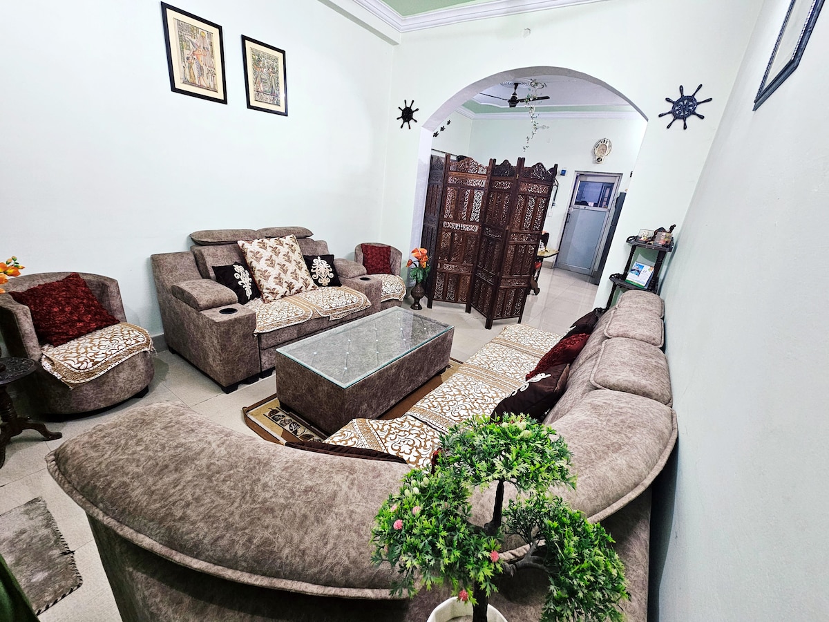 Menginap dengan gaya di tempat kami yang luas seluas 2.100 kaki persegi. Rumah lantai dasar 3BHK di Gomti Nagar yang mewah. Sangat cocok untuk perjalanan bisnis, liburan, atau liburan keluarga, tempat ini memadukan kenyamanan, keanggunan, dan kemudahan. Kami adalah HosTeladan Airbnb yang bangga dengan 350+ malam masa inap 5 bintang dan ulasan tamu yang luar biasa. Hanya 30 menit dari Stasiun Charbagh dan 30 menit dari Bandara Lucknow (T3), dengan taman, kafe, dan pasar di dekatnya. Nikmati keramahtamahan yang hangat dan penginapan yang terasa seperti di rumah, hanya saja lebih baik.