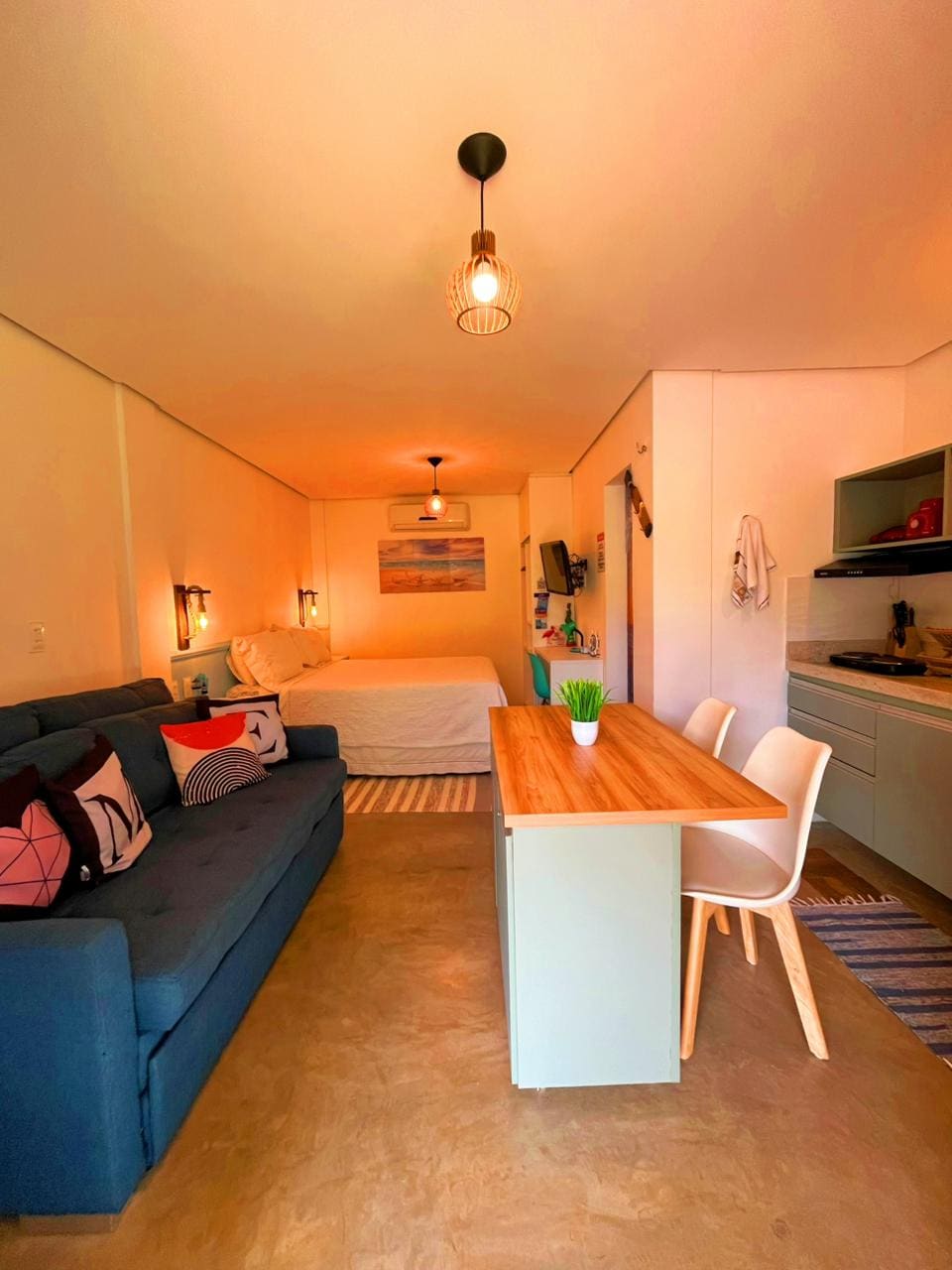 Seja bem-vindo ao seu refúgio particular onde o conforto moderno encontra o charme rústico da praia. Este flat independente foi cuidadosamente decorado com uma temática náutica em tons de azul e branco, oferecendo um ambiente relaxante e totalmente equipado para a sua estadia. Conta com cama de casal, sofá-cama, tv, ar condicionado e cozinha compacta. Também está disponível uma cozinha completa compartilhada.