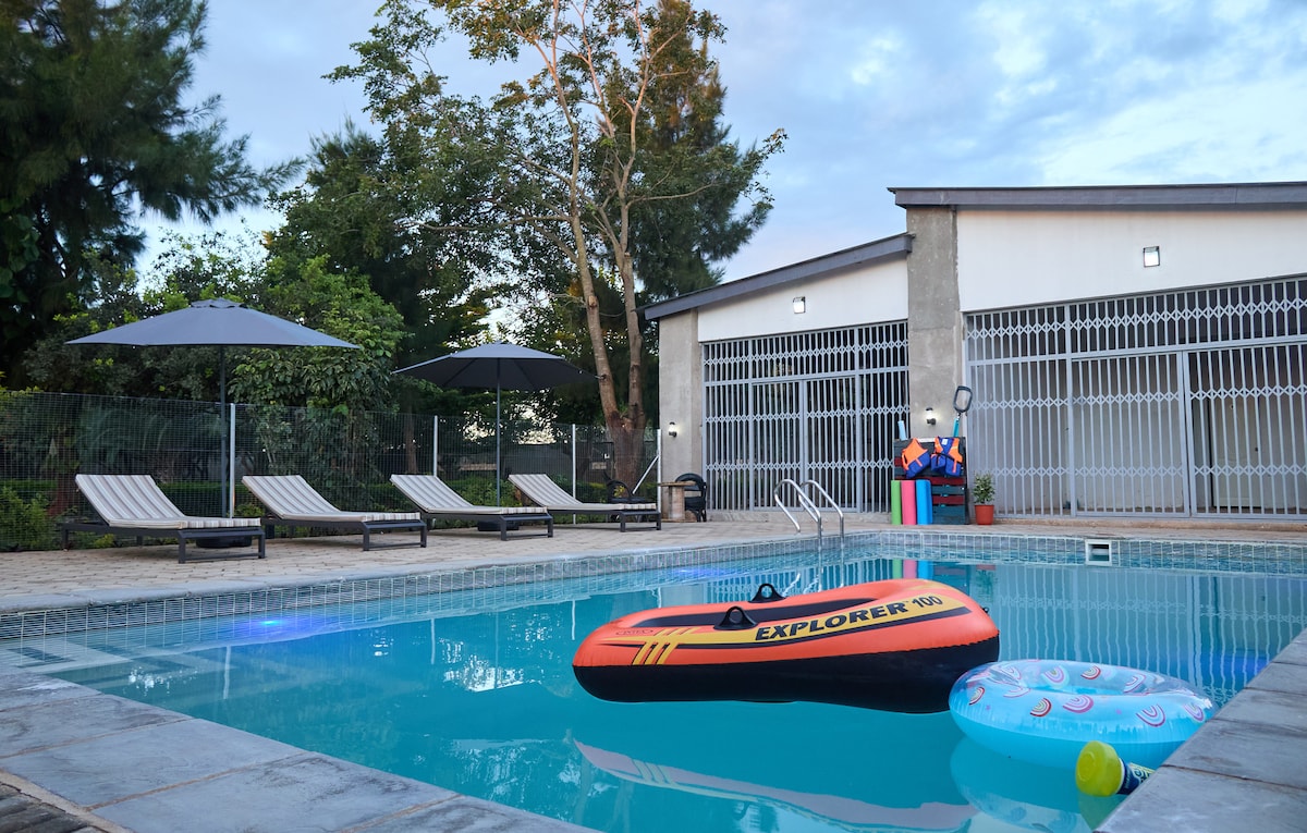 Rumah yang terpusat, namun tenang, tenang, luas dengan taman yang dewasa dan subur. Nikmati kolam renang pribadi yang indah, bersantai di gazebo, dengarkan burung dan saksikan bintang-bintang di malam hari di dekat lubang api di malam hari yang sejuk. Rumah ini dilengkapi dengan staf siang hari yang bisa membantu memasak makanan Anda, mencuci pakaian dan memastikan Anda menginap dengan nyaman, tenaga surya 24/7 untuk semua kebutuhan dasar, wifi starlink, sistem keamanan kelas atas dan sumur bor pribadinya sendiri. Dapat diakses dari Twin Palm atau Great East Road. Dekat dengan airport.
