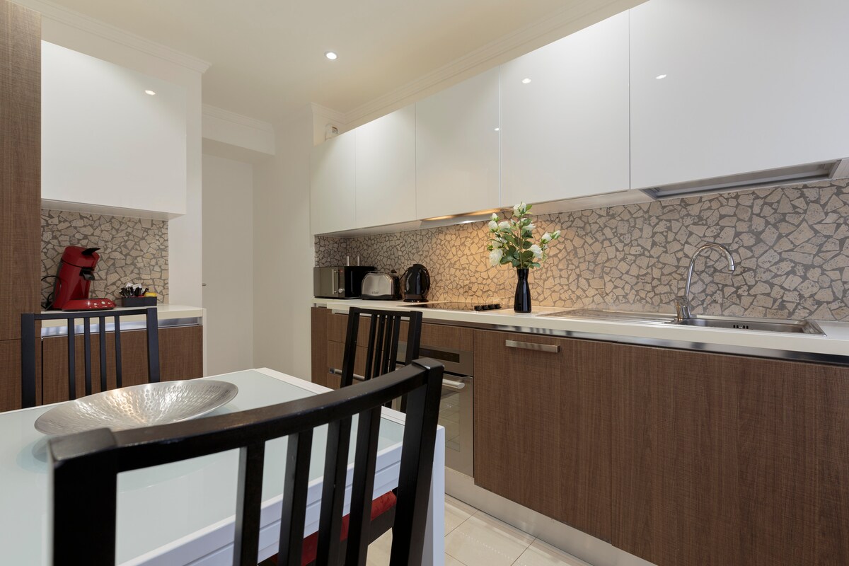 Apartemen dua kamar tidur ini (sekitar 70 meter persegi) menawarkan ruang tamu yang terang dengan tempat tidur sofa yang nyaman dan pemandangan di pusat kota. Dapur berfasilitas lengkap: kompor induksi, microwave, kulkas & freezer, mesin cuci piring, ketel dan pembuat kopi, peralatan dapur berkualitas tinggi. Kamar tidur memiliki kasur berkualitas premium (180x200cm di kamar tidur utama, 160x200 cm di kamar tidur kedua). Pemanas lantai, pancuran walk - in, dan keran baja yang disikat di 2 kamar mandi. Wi - Fi, Smart TV, sistem suara Bluetooth.