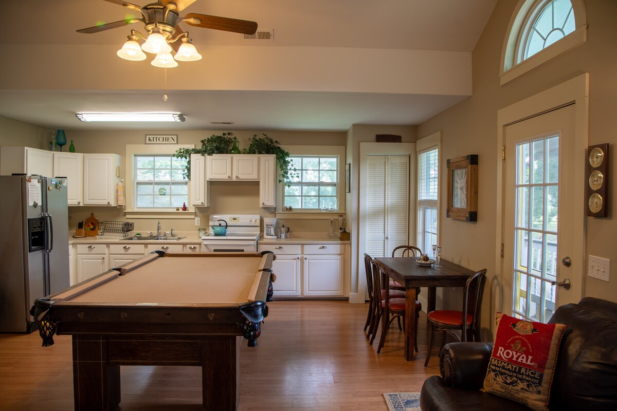 Located behind an 1844 Historic Plantation home listed on the National Register, our guest cottage is behind the main house. With it's own private entrance and porches overlooking horse pastures and barns. There are 150 acres with creeks and trails to ramble about and access to the Flint River located within walking distance (15 min walk). With Huntsville's sprawling growth surrounding us we are minutes to restaurants and shopping. Just 12 min to downtown Huntsville.