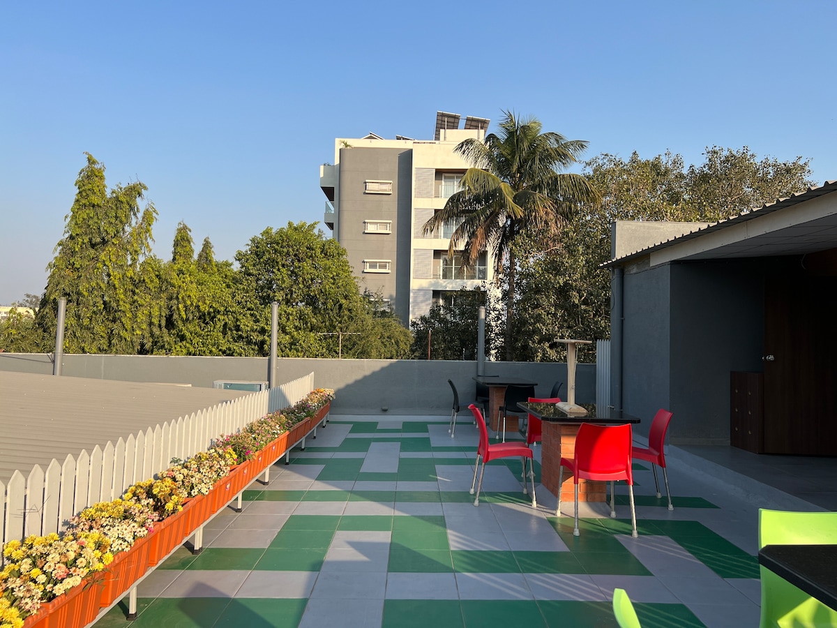 Kami menantikan tamu yang bertanggung jawab & luar biasa! :) ~pemesanan, pertanyaan hanya melalui airbnb~ Townhouse bertingkat 5 kamar tidur unik yang berlokasi di pusat kota ini (sekelompok tempat tinggal tamu) memiliki gaya tersendiri, mengakomodasi hingga 18 orang. Sebagian rumah dibangun seperti pondok. Damai, luas, ramah keluarga. Akses mudah dan mudah ke semua bagian favorit Nashik City. Sangat cocok untuk wisatawan spiritual, wisatawan kesehatan, keluarga, bisnis, dan penginapan korporat.