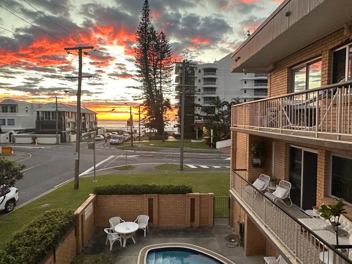 Apartemen dua kamar tidur kami yang ringan dan lapang berada tepat di seberang jalan dari Mermaid Beach yang indah. Saksikan ombak dari balkon dan berjalan - jalan menyeberangi jalan ke pantai yang dipatroli. Sejumlah restoran/kafe funky hanya berjarak dua menit berjalan kaki singkat atau sepuluh menit berjalan kaki ke utara atau ke selatan untuk menemukan salah satu klub selancar lokal kami di mana Anda bisa menikmati minuman atau makanan yang menghadap Samudra Pasifik yang indah. Dengan tuan rumah yang merupakan warga lokal Gold Coast seumur hidup, kami akan dengan senang hati menjawab semua pertanyaan Anda.