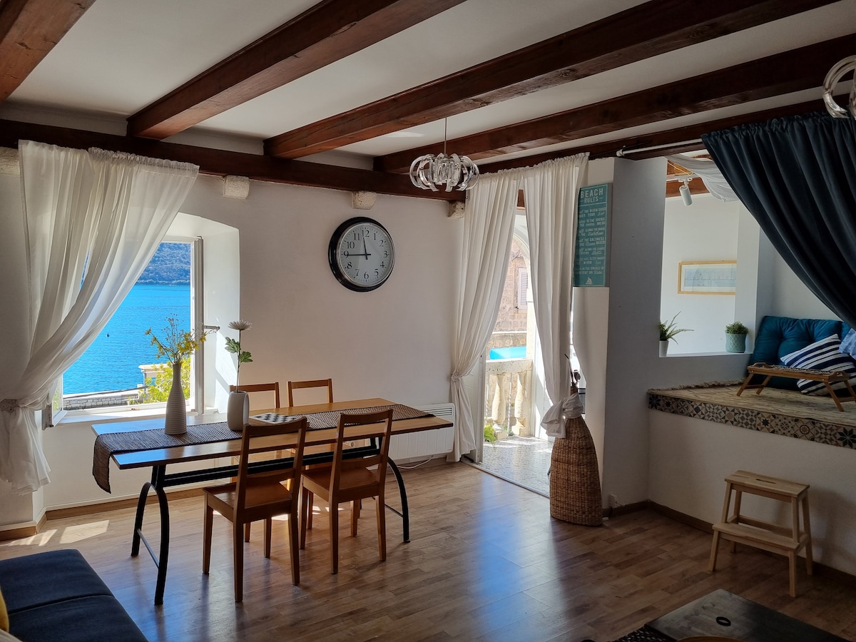 Rumah yang benar - benar berjarak sepuluh langkah dari laut. Di dalam tangga spiral mengarah ke ruang tamu lantai atas, yang mengarah ke teras terbuka dengan pemandangan langsung ke Pulau ‘lady of the rock’ Transportasi umum: layanan bus antara Kotor dan Risan Bandara terdekat adalah Tivat di Montenegro (sekitar setengah jam berkendara dari Perast) Ada banyak restoran di sepanjang Riviera.