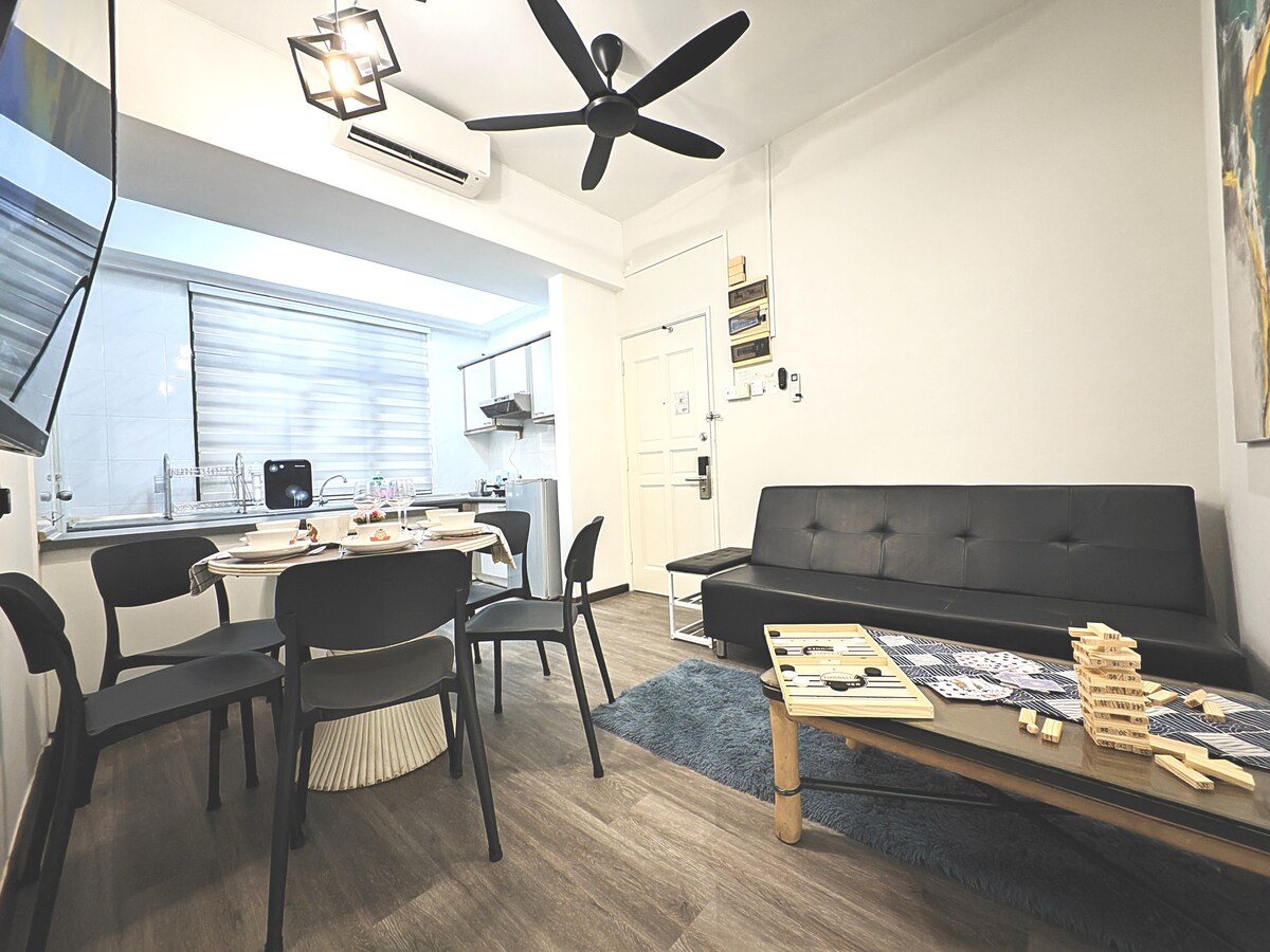 Berapa orang yang bisa menginap di sini: Apartemen bisa menampung 4 orang dan masih nyaman untuk 6 orang. Lokasinya berada di pusat Kota Melaka dan hanya berjarak 3 km dari gedung bersejarah A'Famosa dan Studthuy's Building. Fasilitas: Menyediakan tempat parkir GRATIS untuk 1 mobil di lantai 2. Orang lain bisa parkir di lantai dasar. Daftar fasilitas yang disediakan di dalam rumah: Apartemen bergaya ini juga dilengkapi dengan 2 tempat tidur queen size & 1 tempat tidur sofa lipat berukuran queen, 1 toto ekstra, TV android LED 60", WI - FI, dll.