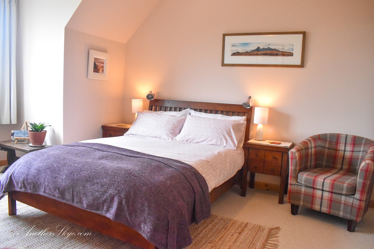 Gael adalah kabin modern di croft yang berfungsi, yang menangkap pemandangan tanpa gangguan di atas teluk Portree, Ben Tianavaig, dan perbukitan Cuillin di kejauhan. Kabin ini sendiri memiliki atrium tinggi penuh yang mencakup dapur kecil fungsional, area tempat duduk, pembakar kayu dan suite kamar mandi tiga potong. Tingkat mezzanine diakses oleh tangga kayu yang menampilkan tempat tidur ganda yang nyaman. Terletak tak jauh dari jalur Scorrybreach, ini adalah landasan peluncuran yang sempurna untuk petualangan Skye Anda.