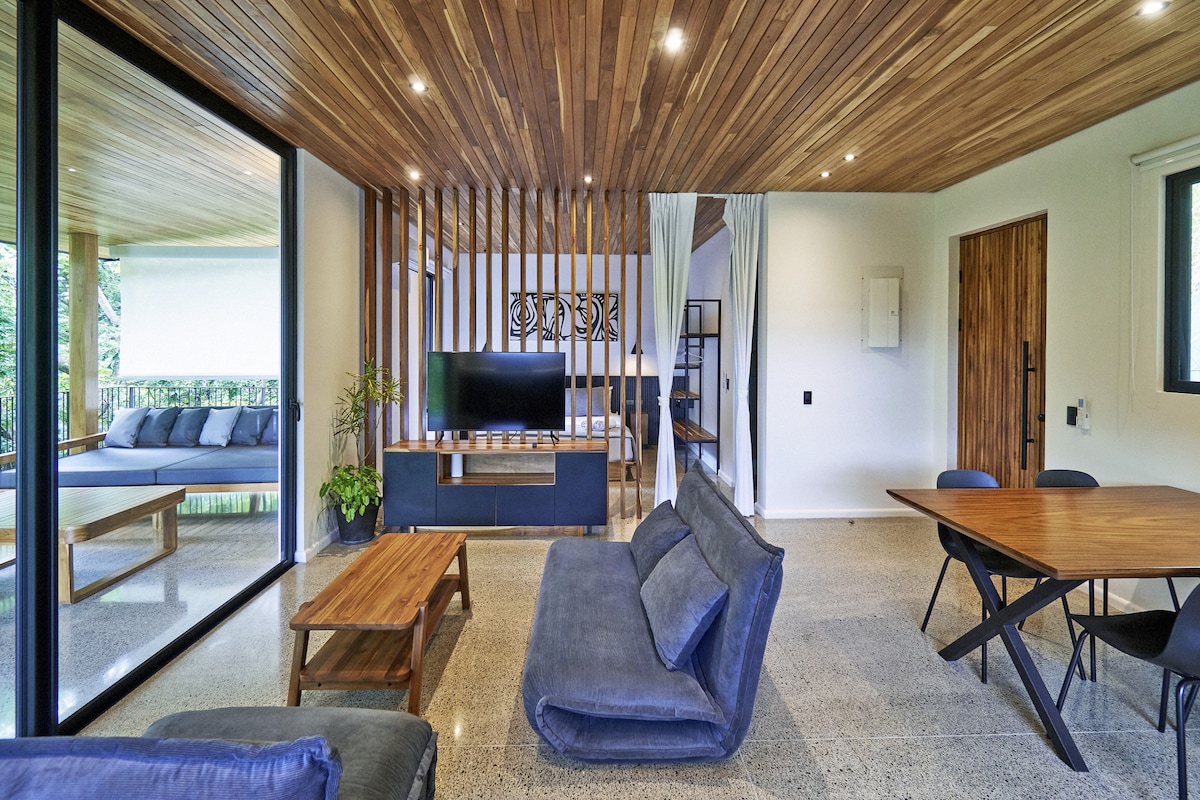 Vila Mal País 2KT/2KM modern dengan kolam renang pribadi dan dek belakang berlandskap rimbun di komunitas berpagar yang aman—5 menit berjalan kaki ke pantai, 2 menit berkendara untuk berselancar di Playa Carmen & Santa Teresa. Wi-Fi fiber cepat, TV pintar 55”, AC, dan kipas angin langit-langit di seluruh ruangan. Dapur berfasilitas lengkap dengan ruang makan dalam dan luar ruangan. Dua kamar tidur queen, pancuran luar ruangan, dan tempat parkir pribadi. Sangat cocok untuk peselancar, pasangan, nomaden digital, atau liburan santai di Kosta Rika.