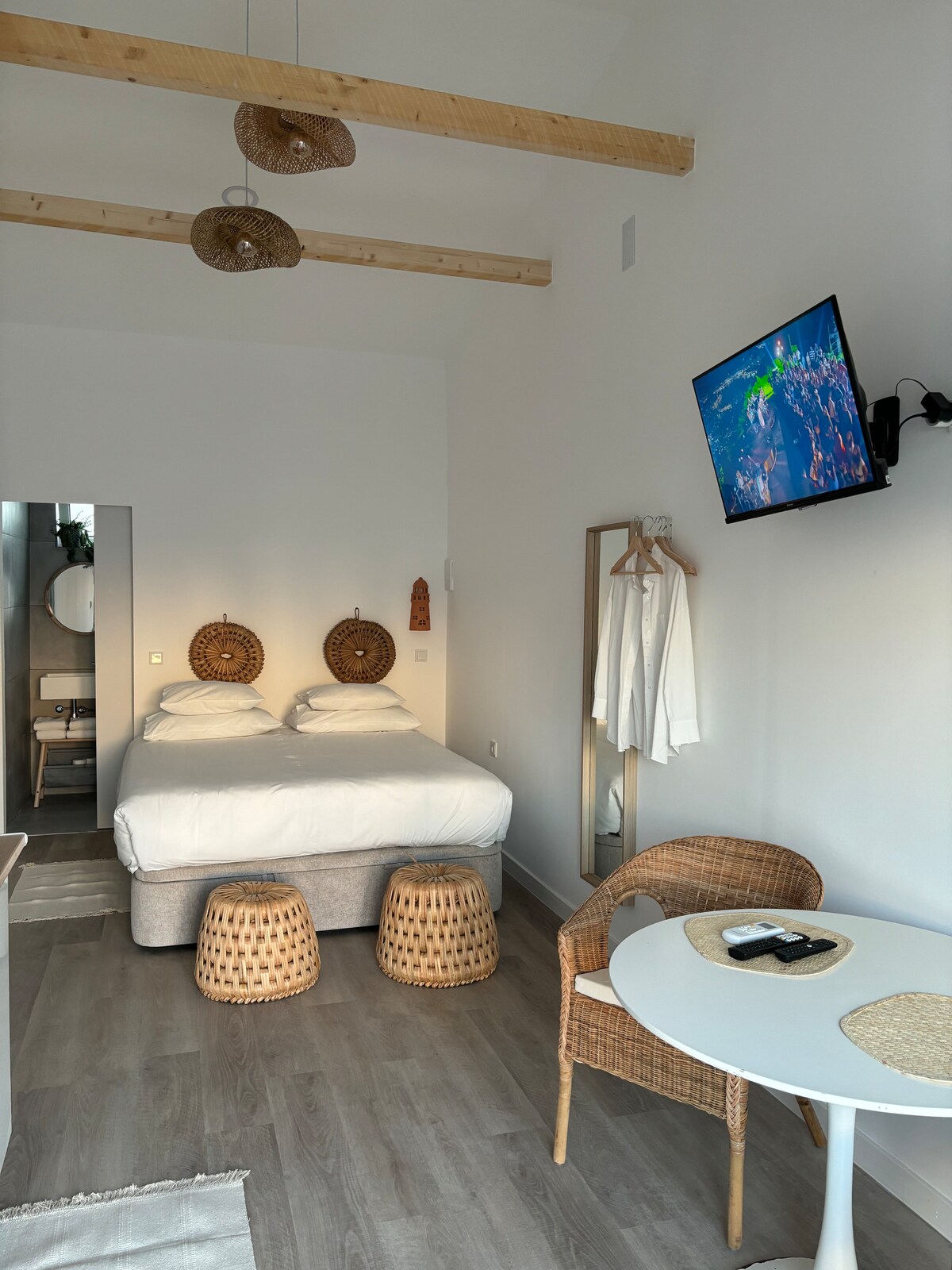 The Pool Pavilion is a cosy and relaxed two suites and kitchen space that overlooks a lush garden and is the ideal choice for a joyful and relaxing getaway. Appointed to a high standard with simple yet sophisticated materials, such as micro cement flooring , stucco walls and linen curtains, and decorated in soothing natural colours, it blends harmoniously with its surroundings. Large patio doors lead out onto a spacious, private garden with wood decking, a heated pool, sun loungers and table.