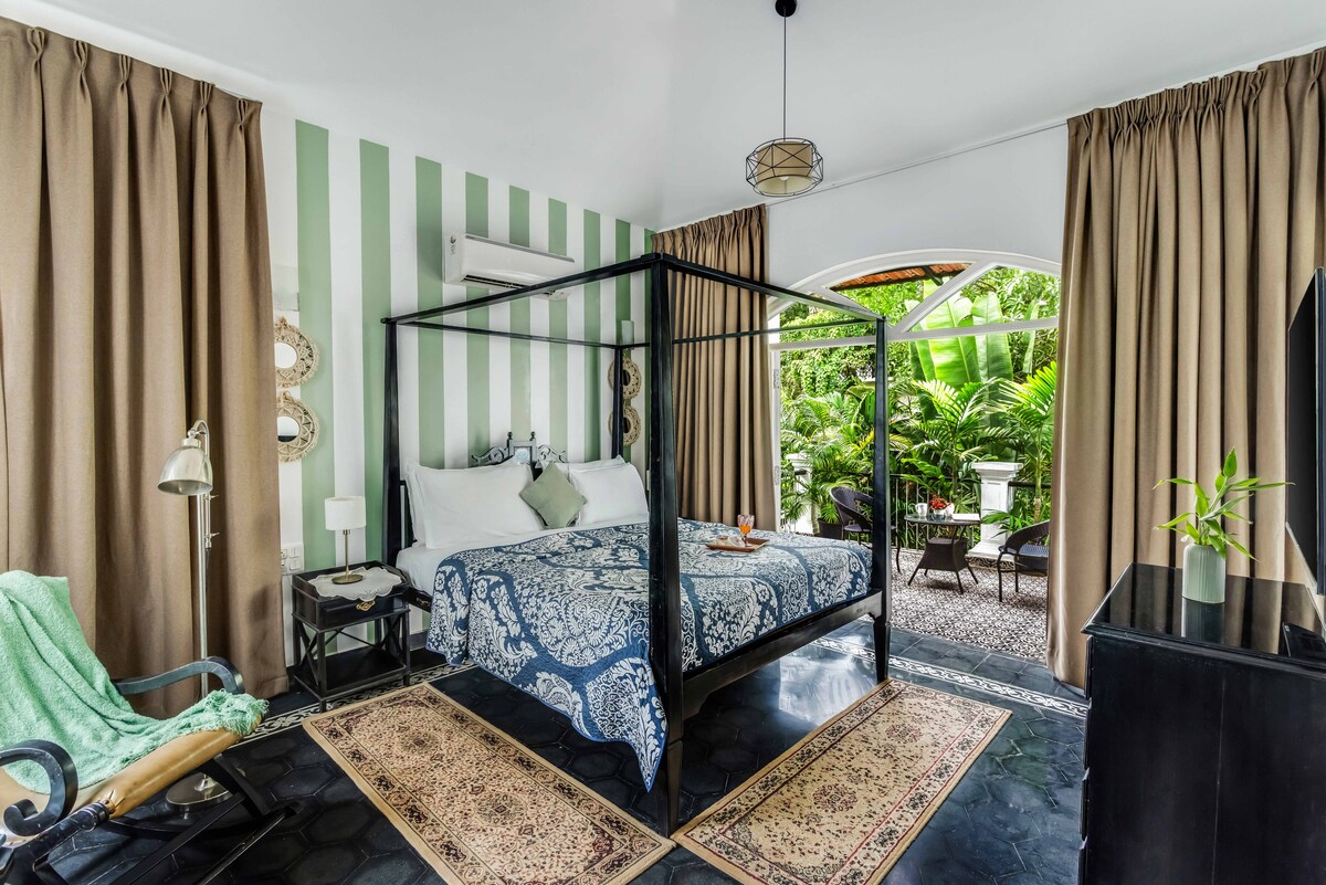 Bebaskan diri Anda ke tempat persembunyian tropis pribadi di pusat kota Calangute. Harap perhatikan: * Kolam renang terjun sepenuhnya pribadi & tersambung ke kamar tidur dengan pemandangan pohon palem Goan yang indah (ini bukan jacuzzi atau bak mandi air panas). * Tamu juga memiliki akses ke kolam renang atap bersama (08.00 - 20.00), sangat cocok untuk berendam saat matahari terbenam. * Cadangan daya tersedia untuk lampu, kipas angin, Wi-Fi, dan pengisian daya.