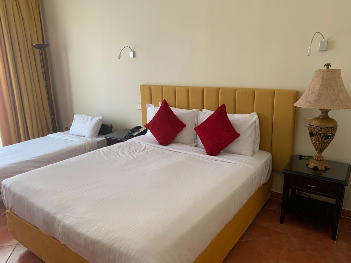 hotel roomi in building with hotel sevice that include cleaning , brackfast and secuirty in north coasrt nearby from marina by 1 kilo and have swimming pool and beach in village . and 2 supermarket and cafe in hotel