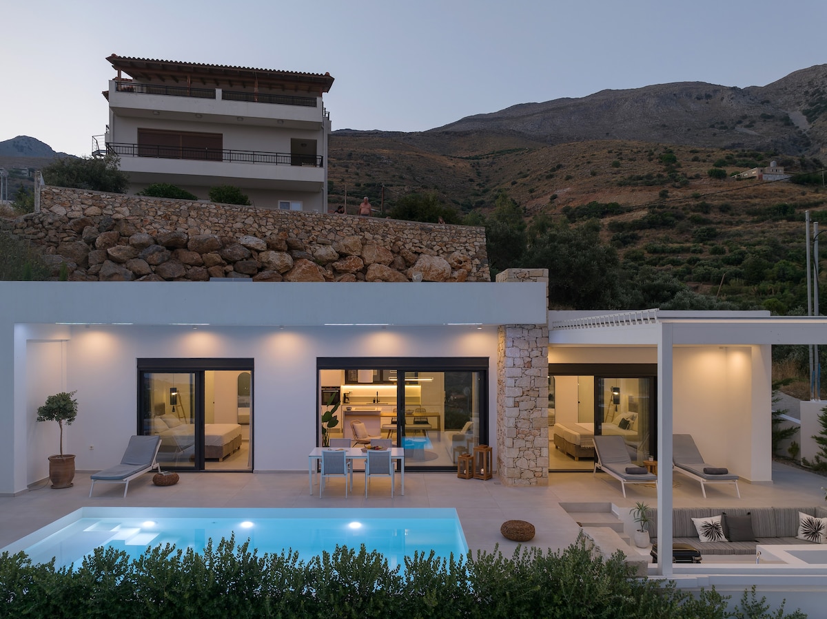 Petres 2 is a stylish, 100-square-meter villa nestled within a small complex of four exclusive properties, located on the outskirts of Mariou village in southern Crete. Just a short drive from pristine sandy beaches, this serene retreat offers breathtaking views of the South Cretan Sea and the surrounding natural landscape.