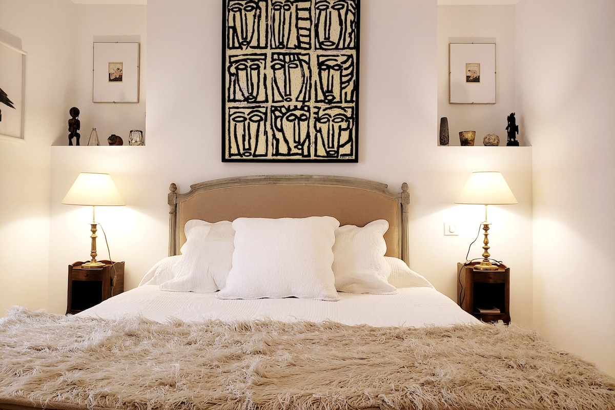 Di Drome provençale, di samping Grignan, di antara tanaman merambat dan lavender, pondok kami adalah satu - satunya di properti ini. Letaknya di lantai atas, untuk empat orang dewasa, bersebelahan dengan mas pemiliknya. Ruang tamu seluas 48 m2, dengan dapur terbuka lengkap, area relaksasi dengan TV 127 cm, AC. Suite utama seluas 35m2 dengan pancuran Italia, wastafel ganda, toilet independen, AC. Mezzanine seluas 30 m2. Kedua tempat tidur berukuran 160 X 200. Teras pribadi dengan barbekyu weber
