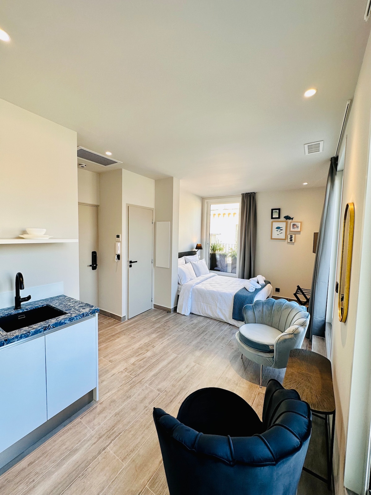 Studio, yang bisa menampung hingga dua orang, mencakup: ruang tamu dengan tempat tidur, area kantor, dapur lengkap (kompor keramik kaca, kulkas, microwave, piring...), kamar mandi, televisi layar datar (satelit), dan brankas. Kapasitas akomodasi maksimum adalah 2 orang dan satu anak di bawah 3 tahun.