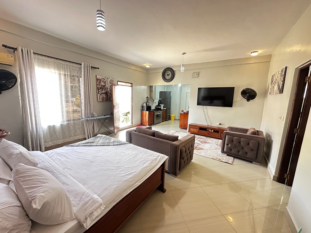 Baik mengunjungi Dar es Salaam untuk bisnis maupun bersantai, apartemen kami menawarkan liburan kota yang canggih yang memenuhi kenyamanan, privasi, dan kemudahan. Tempat tinggal 1 kamar tidur yang elegan ini terletak di lingkungan tinggal utama dan tenang di dekat Masaki, Msasani, CBD, dan Upanga—hanya 1 menit dari Dar Village Mall dan Kuku Kuku Bar & Restaurant. Nikmati tempat tidur yang nyaman, kamar mandi pribadi, Smart TV 32", workstation yang apik, pencahayaan modern, dan penyimpanan yang luas—sempurna untuk bersantai, bekerja, atau menjelajahi kota dengan mudah.