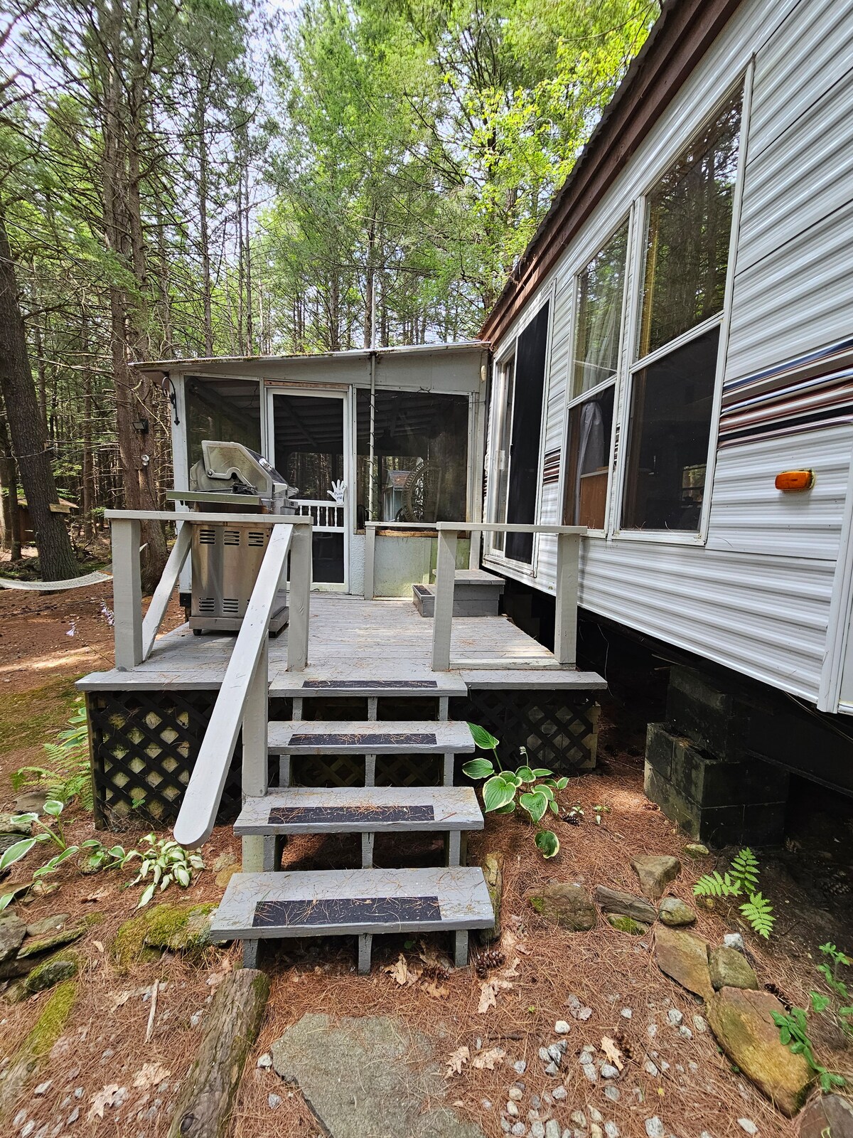 Model taman melarikan diri di hutan di sungai yang mengalir ke kolam trout yang terisi penuh. Duduklah di teras yang disaring & dengarkan alam sambil bersantai dengan tenang. Terletak di perkemahan pribadi kecil di lahan hutan pribadi seluas 200 hektar di Massachusetts Tengah. Terletak di jalur hiking yang juga digunakan untuk bersepeda gunung & menunggang kuda. Bawalah seprai sendiri tetapi dapur yang memiliki peralatan lengkap. Tidak ada wi - fi...tidak ada tv... layanan seluler minimum. Tempat yang luar biasa untuk menikmati bagian luar ruangan, memutuskan hubungan & memulihkan diri.