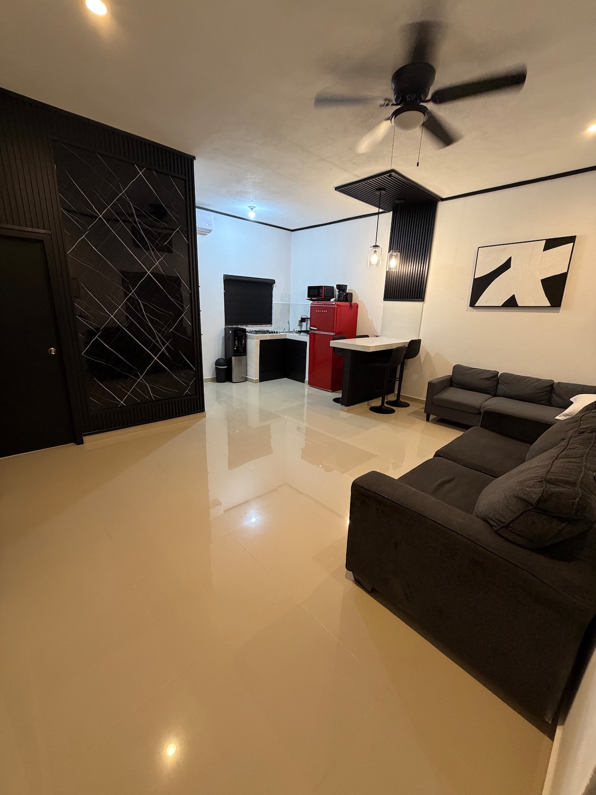 Apartemen yang luas dengan dapur kecil (kulkas, microwave, meja makan yang menempel di dinding). Kamar mandi lengkap dengan air panas dan dingin, dengan pegangan. Tempat tidur QUEEN, TV Smart 40". Internet. Parkir di dalam properti.