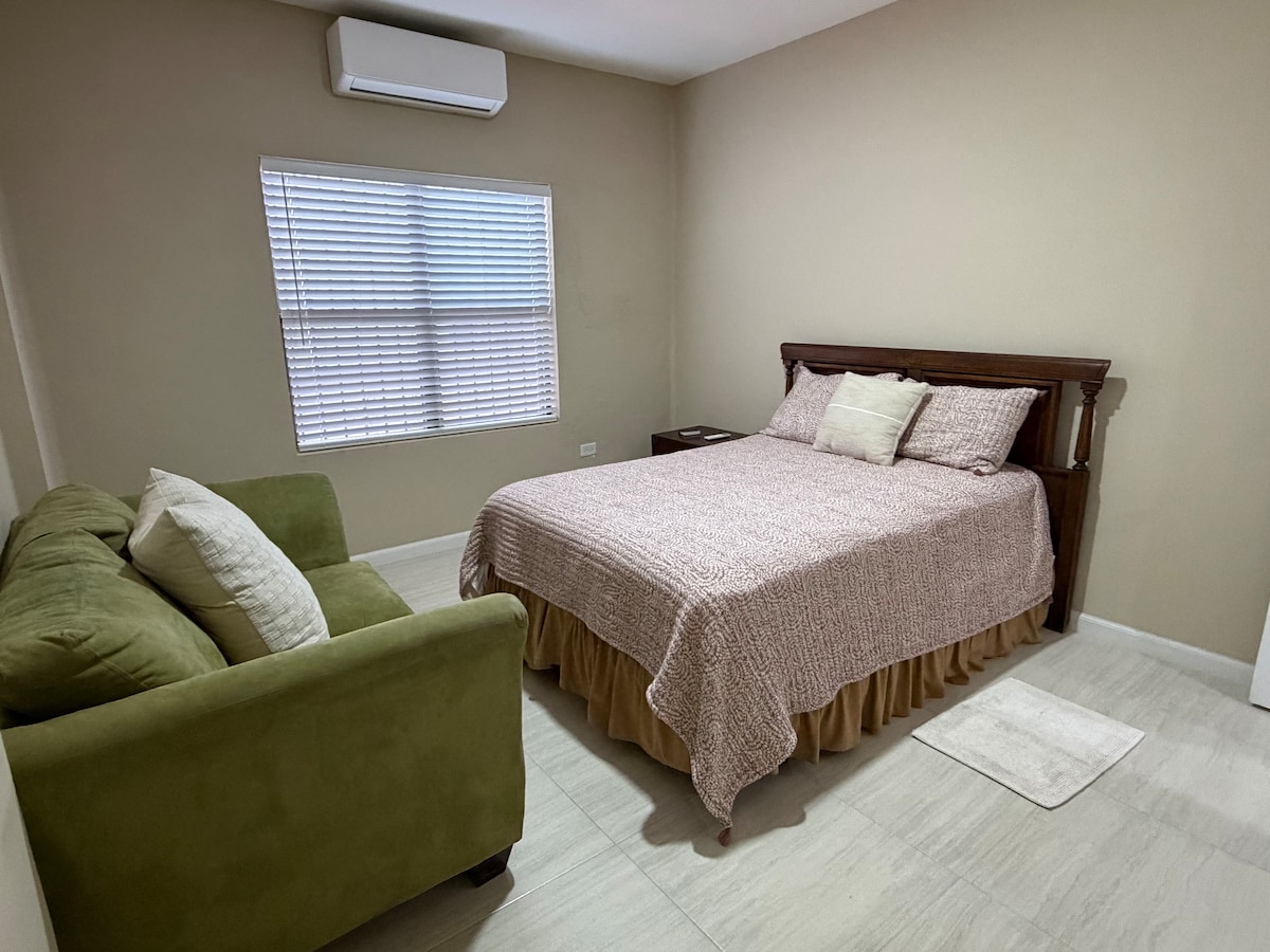 Suite modern dengan sentuhan industri, dengan kamar mandi sendiri, dapur, ber-AC dengan AC panas/dingin, internet berkecepatan tinggi, Smart TV (Netflix terbuka), ruang tamu, area umum, alat pemadam kebakaran (4), detektor asap di setiap kamar, pusat pengisian daya USB per kamar. Luar biasa untuk Wisata Buruh, Medis, atau Keluarga. Tempat yang sangat sentral dan tenang, berlokasi di salah satu kawasan paling aman dan paling sentral di kota ini. Nikmati akses mudah ke Konsulat, 3 jembatan internasional, dan pantainya.