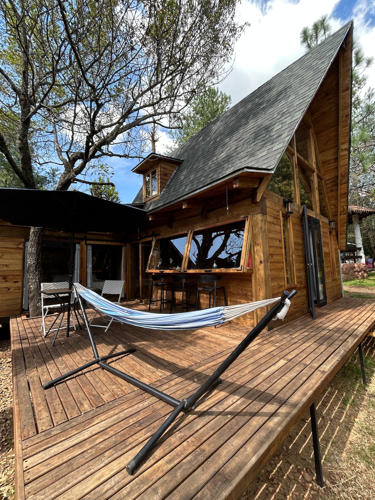 Cabaña a solo 10 min del centro de Pátzcuaro. Con todas las comodidades y rodeada de naturaleza que hará de tu estancia una experiencia de descanso y relajación. Cuenta con chimenea de leña, asador, fogatero. Áreas verdes con juegos infantiles y hamacas. La recámara principal cuenta con una cómoda cama King size y baño interior. Cocina equipada con todo lo necesario para tus comidas y una barra - comedor panorámica para que la disfrutes en tus comidas o celebraciones