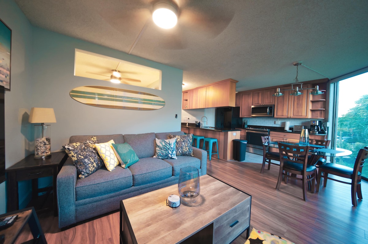 Kondominium bertema pantai yang telah direnovasi di Oceanside Maui Sunset ini dinaungi oleh matahari sore di sisi B. Tarif kami sudah termasuk pajak negara bagian sebesar 19%! 2 kamar mandi lengkap, TV 75" baru, kompor, meja dapur kuarsa, dan kasur futon tebal baru serta tempat tidur queen berkelas tinggi di kamar tidur. Pemandangan dari lanai berada di atas area resor (kolam renang pribadi terbesar di Kihei) & ke arah laut. Unit beton yang dibangun di kompleks yang dikelola dengan baik ini pribadi dan aman. internet (196Mbps). Ramah Keluarga!