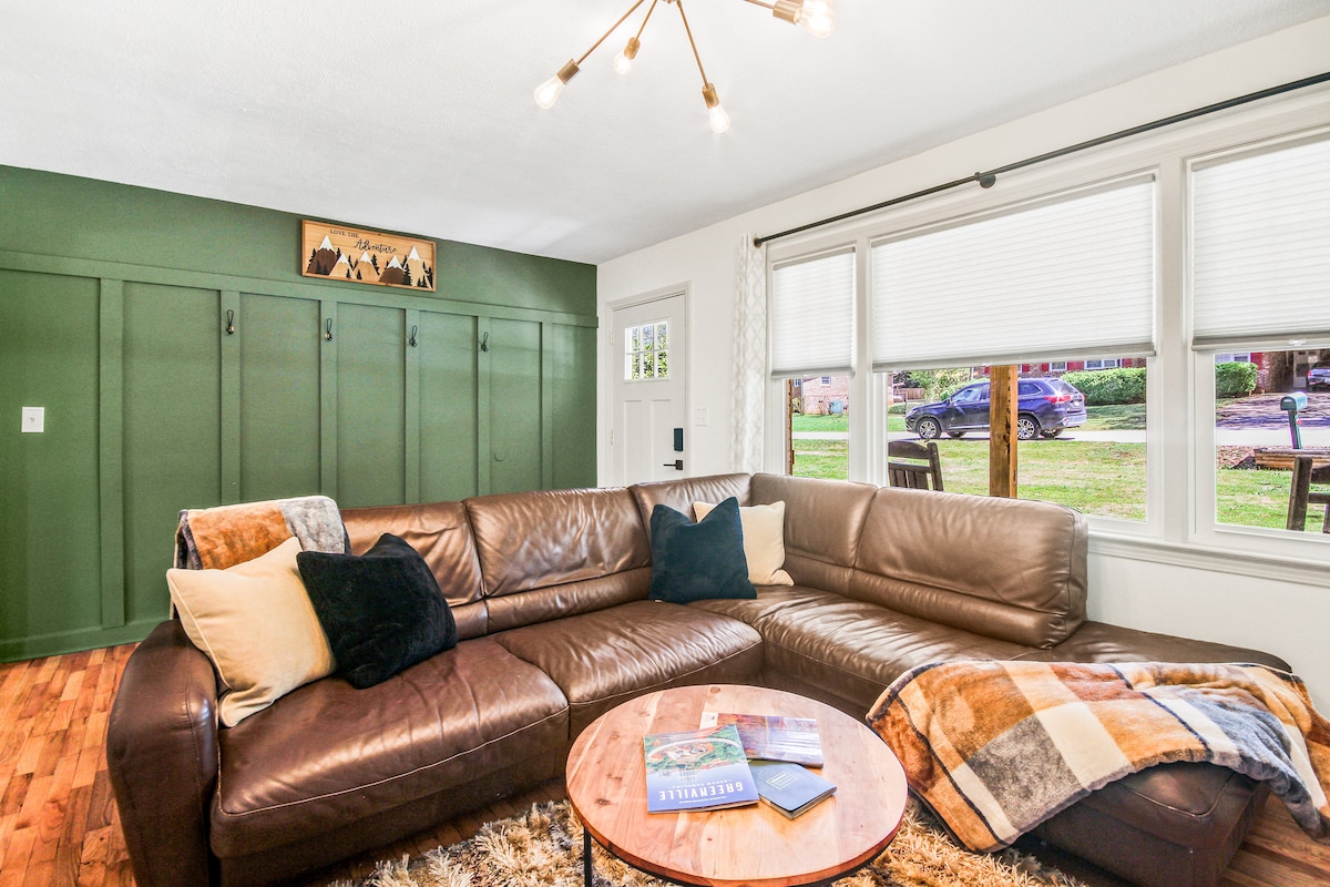 Cozy 2B/1BA home thoughtfully designed to showcase the charm of Greenville. Only 3 miles to downtown, walkable to the Farmer's Market and allows quick access to I-85, GSP, shops, dining, and local attractions. Unwind in the fenced in backyard with a fire pit and deck. Inside, enjoy a welcoming living room, a parlor room with coffee bar, and home office complete with workout gear and futon (sleeps 2). Equipped with luxury linens, a stocked kitchen, washer/dryer, smart TVs, and high-speed Wi-Fi.