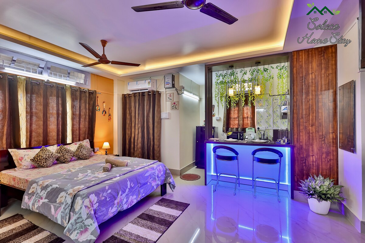 Apartemen dengan 1 tempat tidur double (ukuran King), lemari pakaian, meja rias yang terpasang di kamar mandi dan dapur dengan layanan lengkap yang besar,balkon dan teras pribadi di lantai 3 ( maaf tidak ada lift ) bungalow kami. Bisa muat satu tempat tidur ekstra jika diperlukan ideal untuk 2 orang tetapi bisa tidur 3 orang. Apartemen ini indah & luas dan sangat nyaman dalam hal lokasi dan komunikasi. Tempat ini sangat cocok untuk keluarga, wisatawan solo, perjalanan bisnis, backpacker, dan untuk masa inap yang lebih panjang