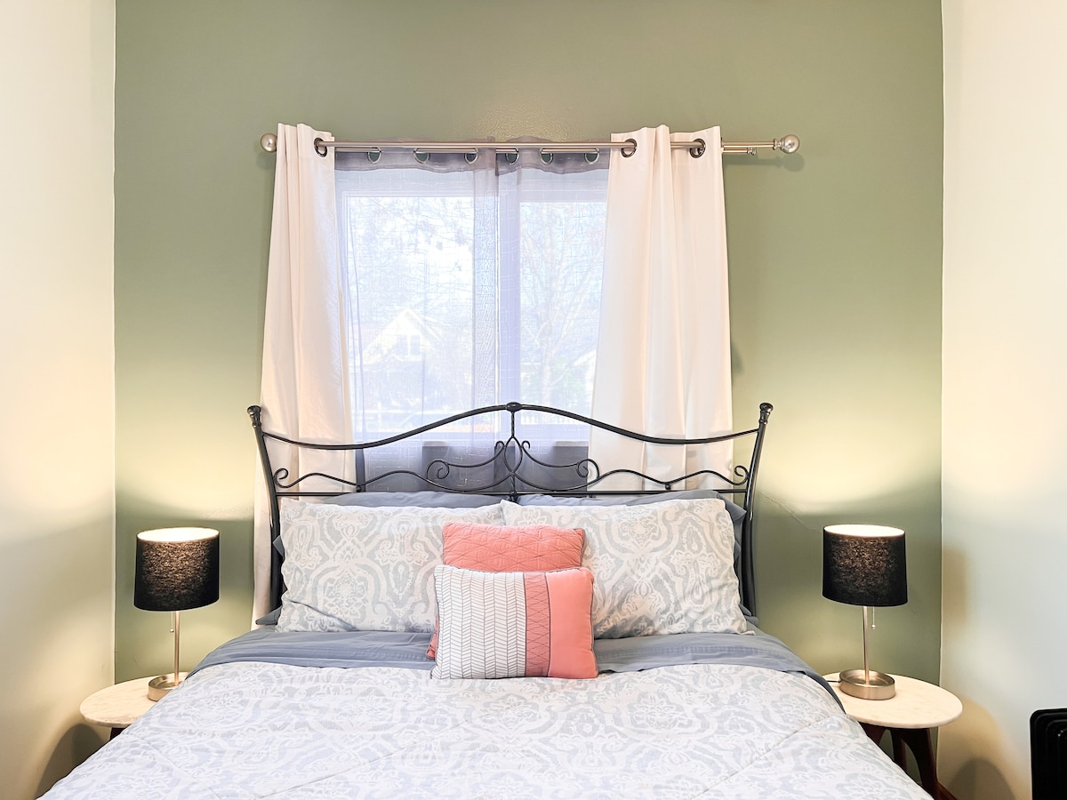 Suite seluas 770 kaki persegi yang terang ini terdiri dari seluruh lantai atas rumah saya dengan dua kamar tidur luas dengan tempat tidur queen, ruang keluarga besar dengan tempat tidur sofa queen, dan kamar mandi dengan wastafel ganda dan bak mandi/pancuran. Tidak ada dapur, tetapi termasuk kulkas ukuran apartemen, microwave, pembuat kopi, panci instan, dan oven/air fryer konveksi. Saya menyediakan sarapan (yogurt, buah, granola, sereal, kopi, teh, krim). Tamu masuk melalui pintu depan rumah bersama, dan naik ke lantai atas ke suite.